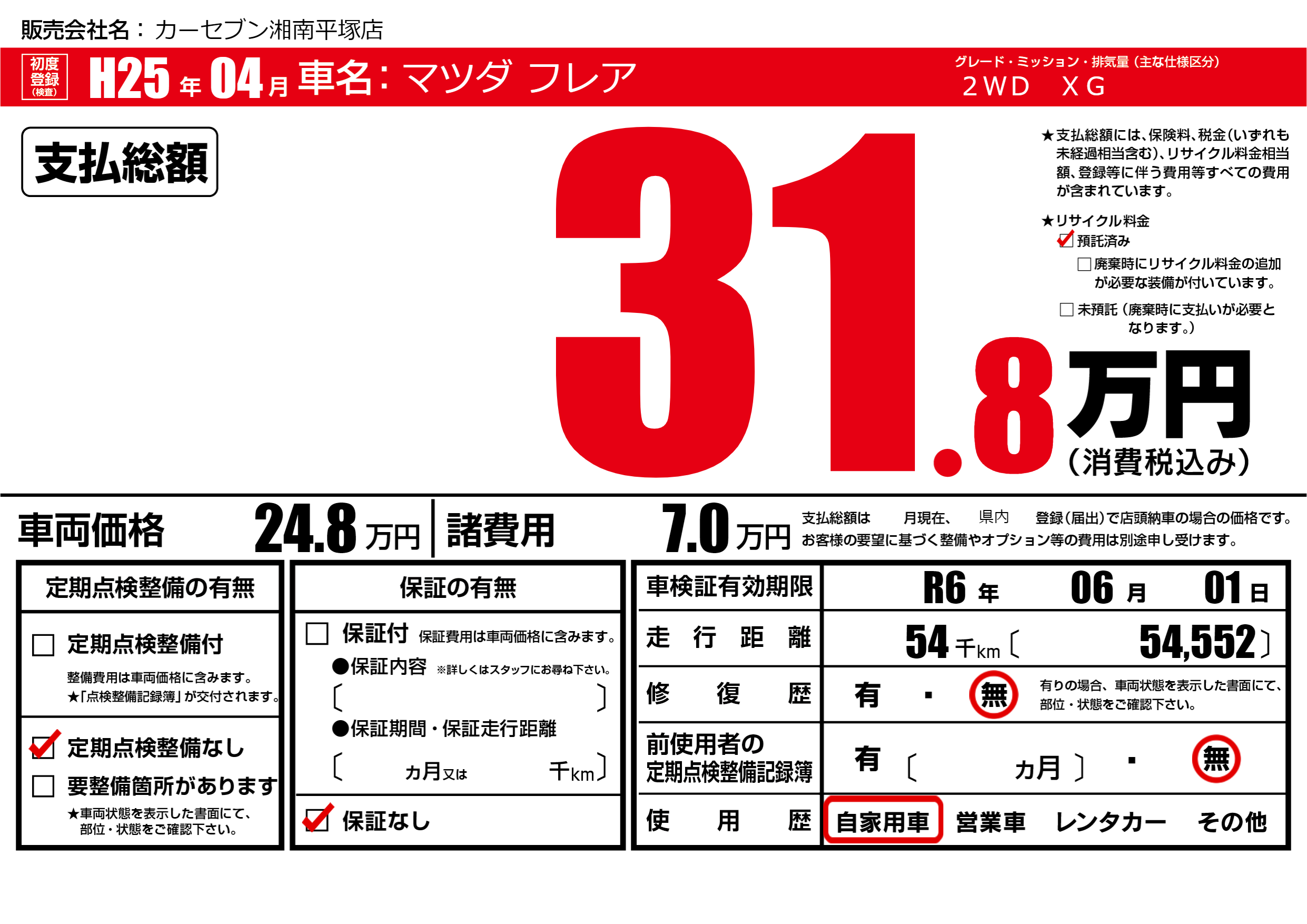 | 車名 | マツダ フレア | グレード ミッション 排気量 |