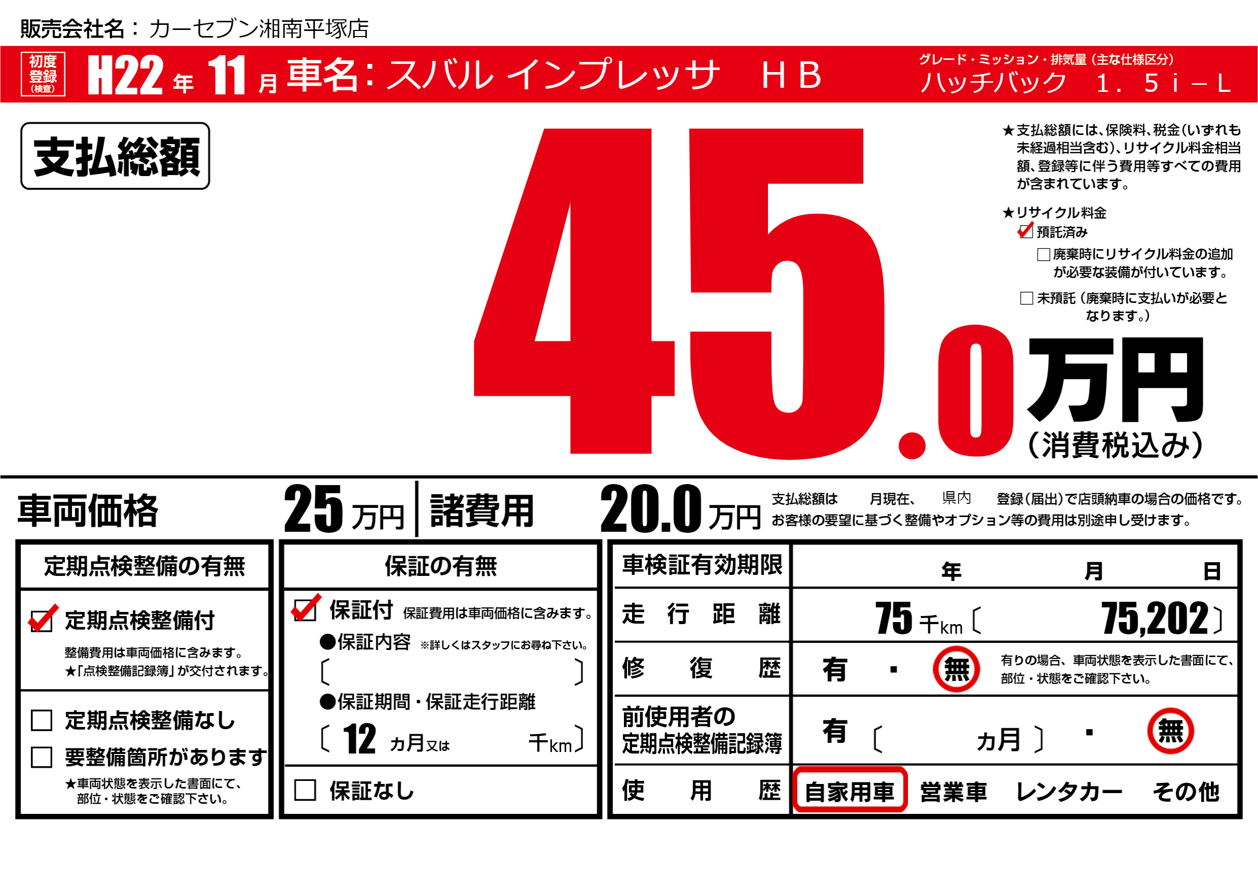 | 車名 | スバル インプレッサ HB | グレード ミッション 排気量 |