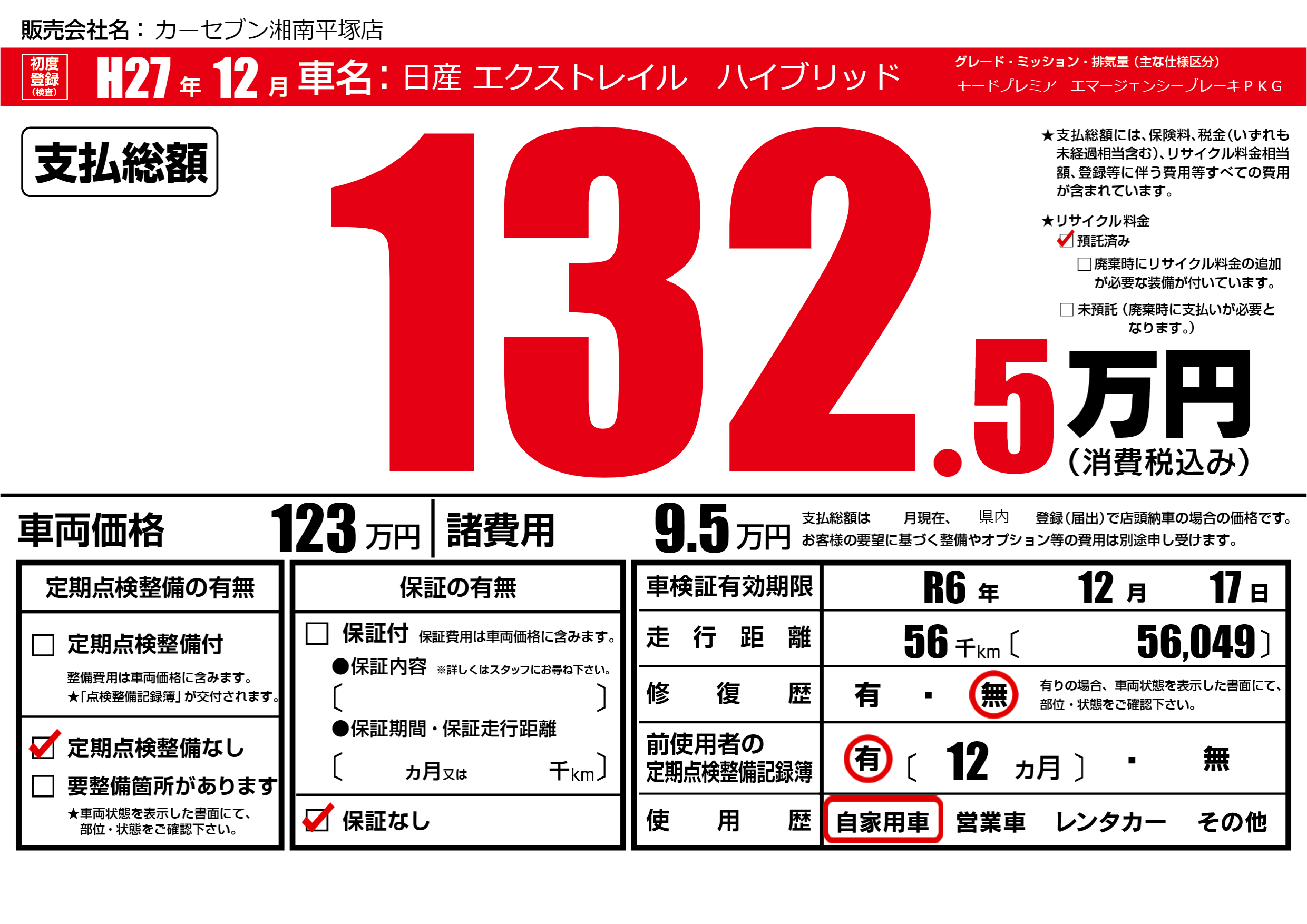 | 車名 | 日産 エクストレイル ハイブリッド | グレード ミッション 排気量 |