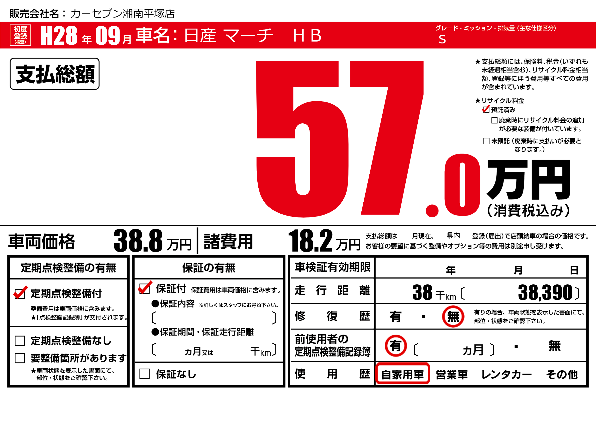| 走行キロ | 3.8万km | 初年度登録 | H28年09月 |