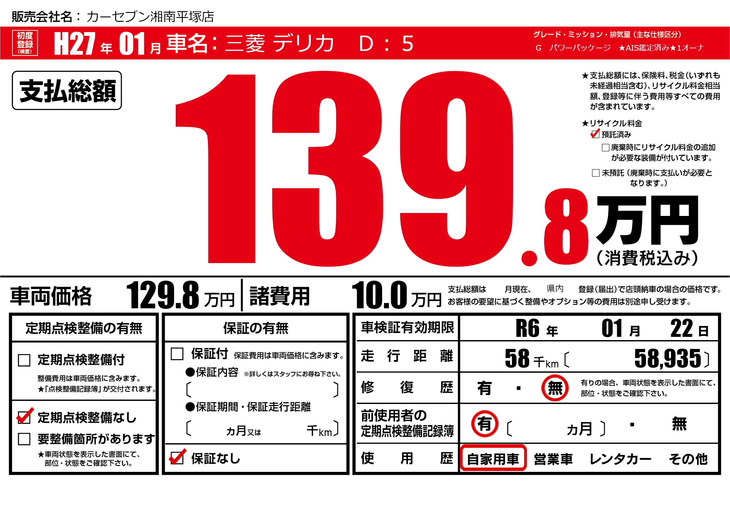 なし | 車検制限 | R6年01月22月 |