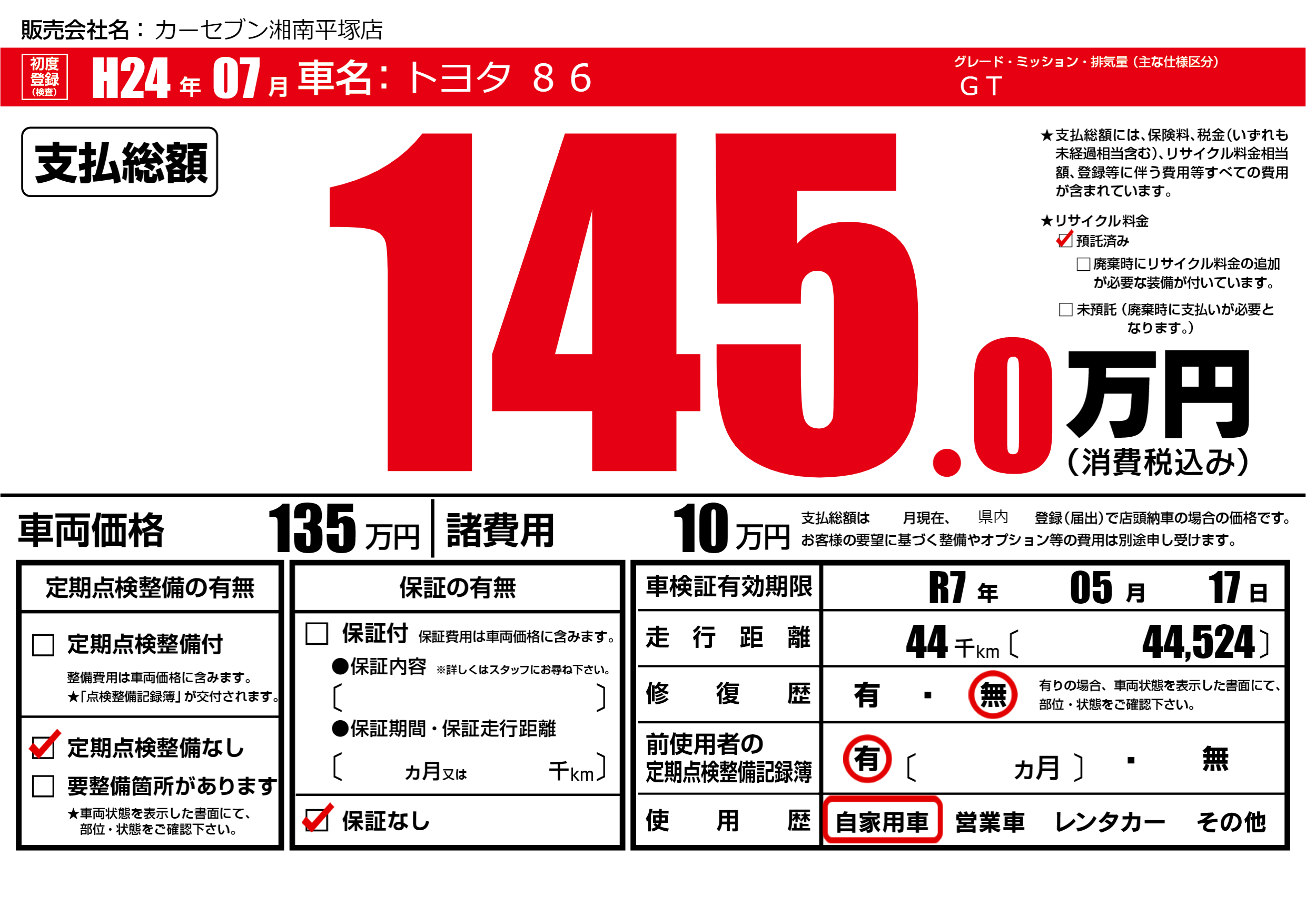 | 車名 | トヨタ 86 | グレード ミッション 排気量 |