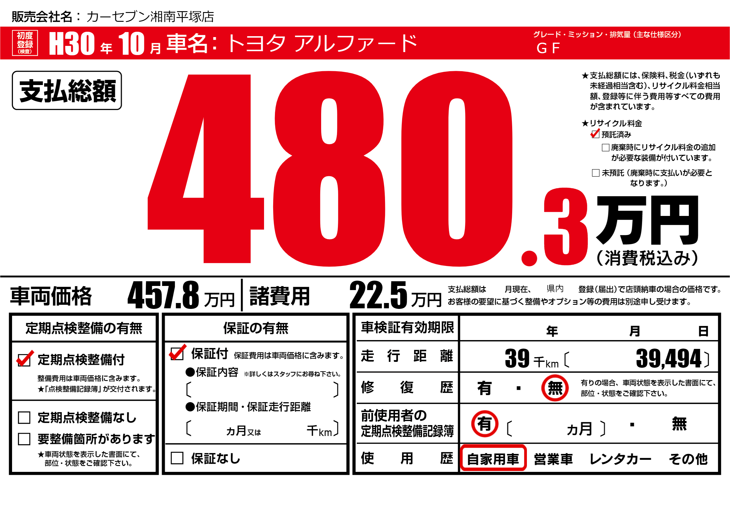 | リサイクル料金 預託済 |