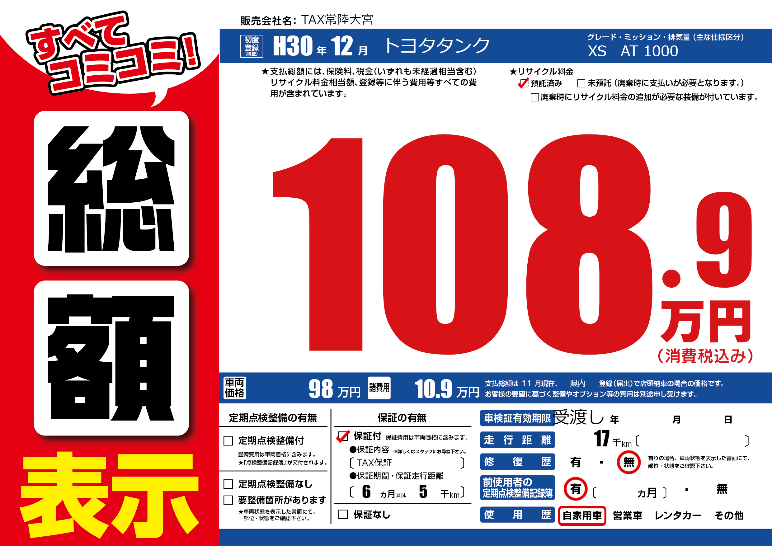 保証付き 保証内容(TAX保証) 6ヶ月または(5)千kmまで |
