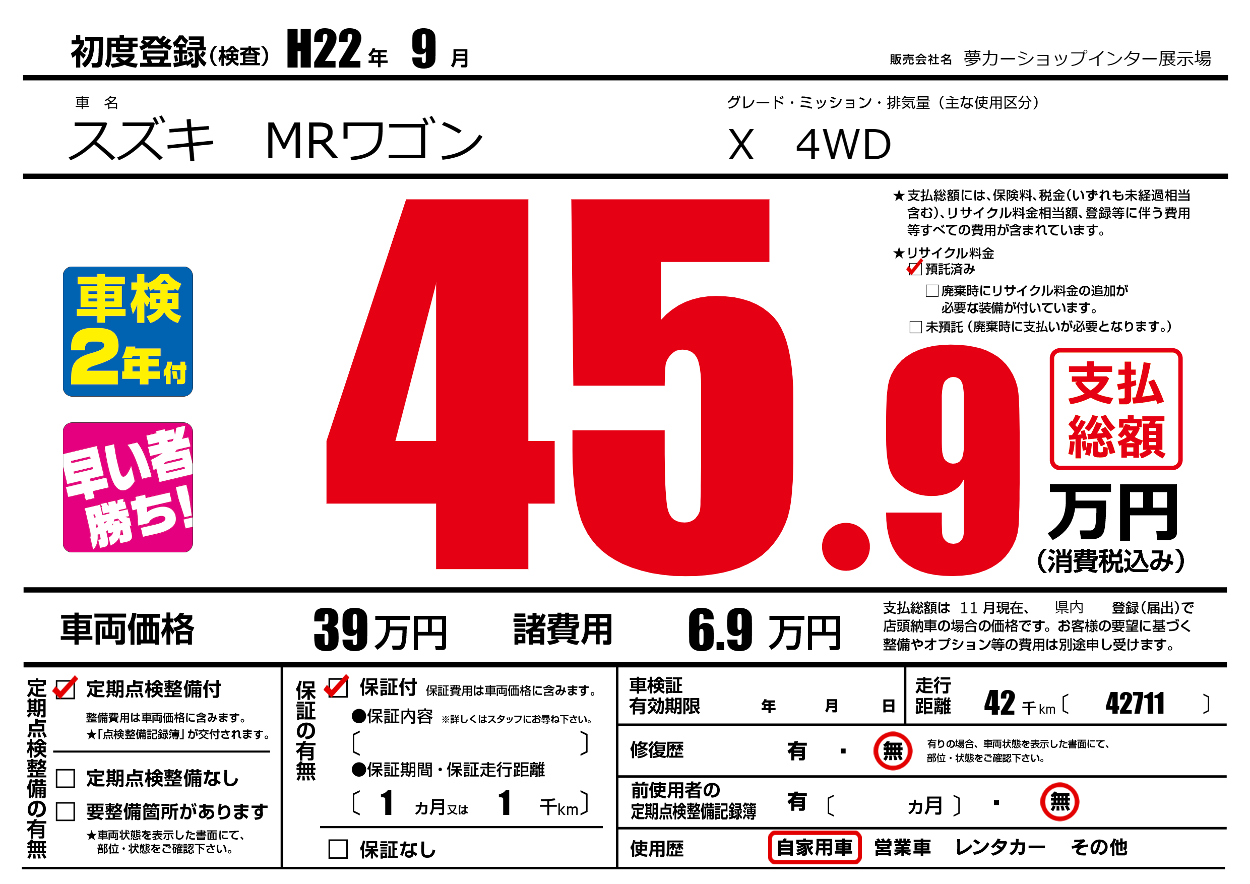 | 走行キロ | 4.2万km | 初年度登録 | H22年9月 |