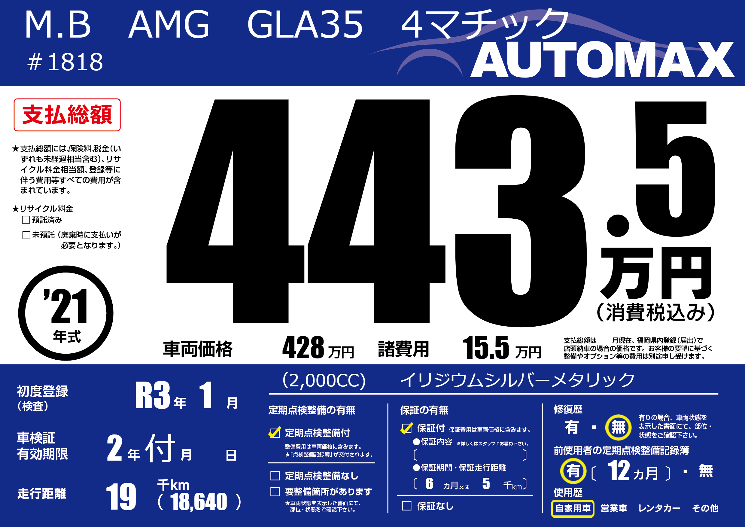 | 車名 | M.B AMG GLA35 4マチック | グレード ミッション 排気量 |