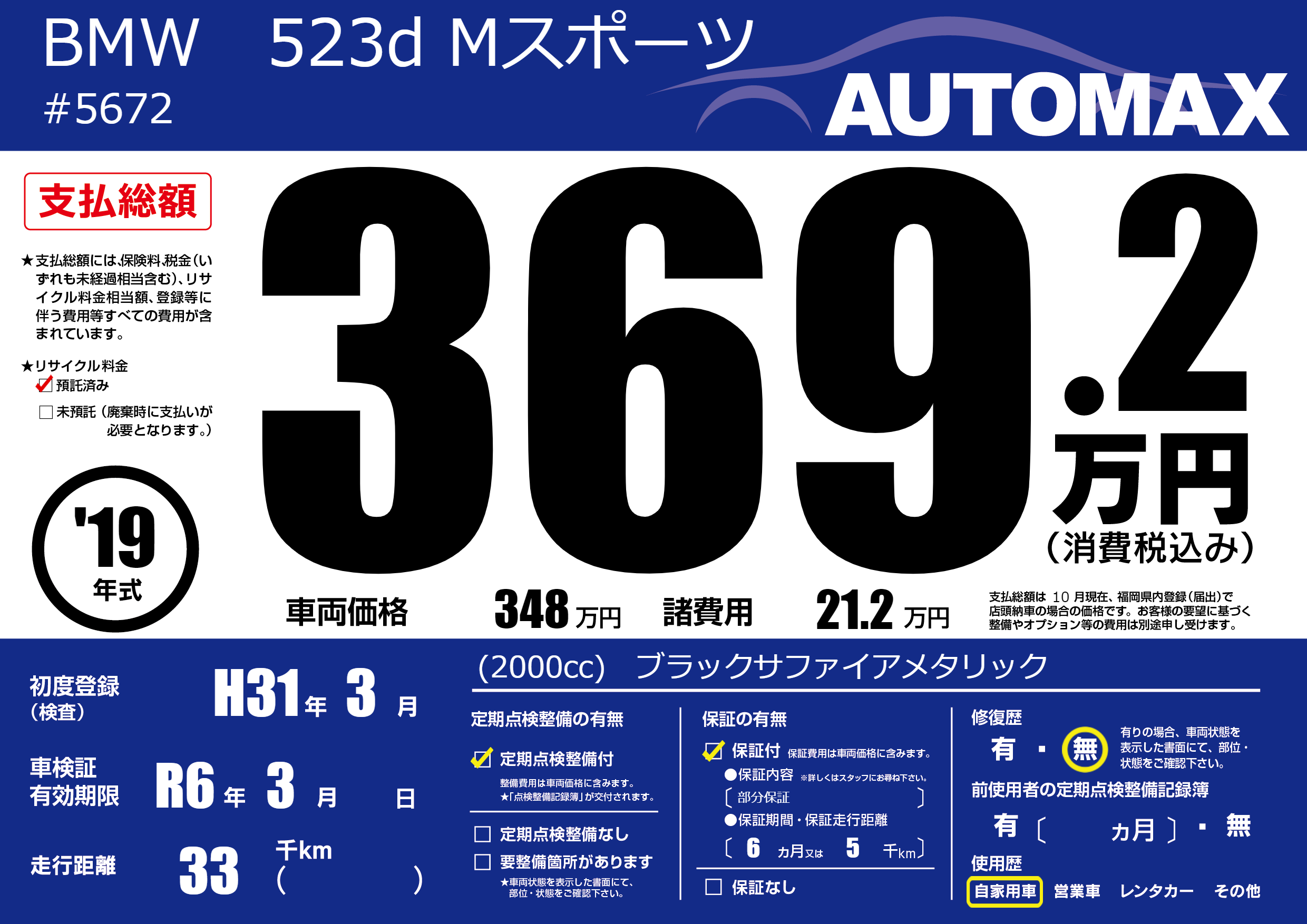 | 車名 | BMW 523d Mスポーツ | グレード ミッション 排気量 |