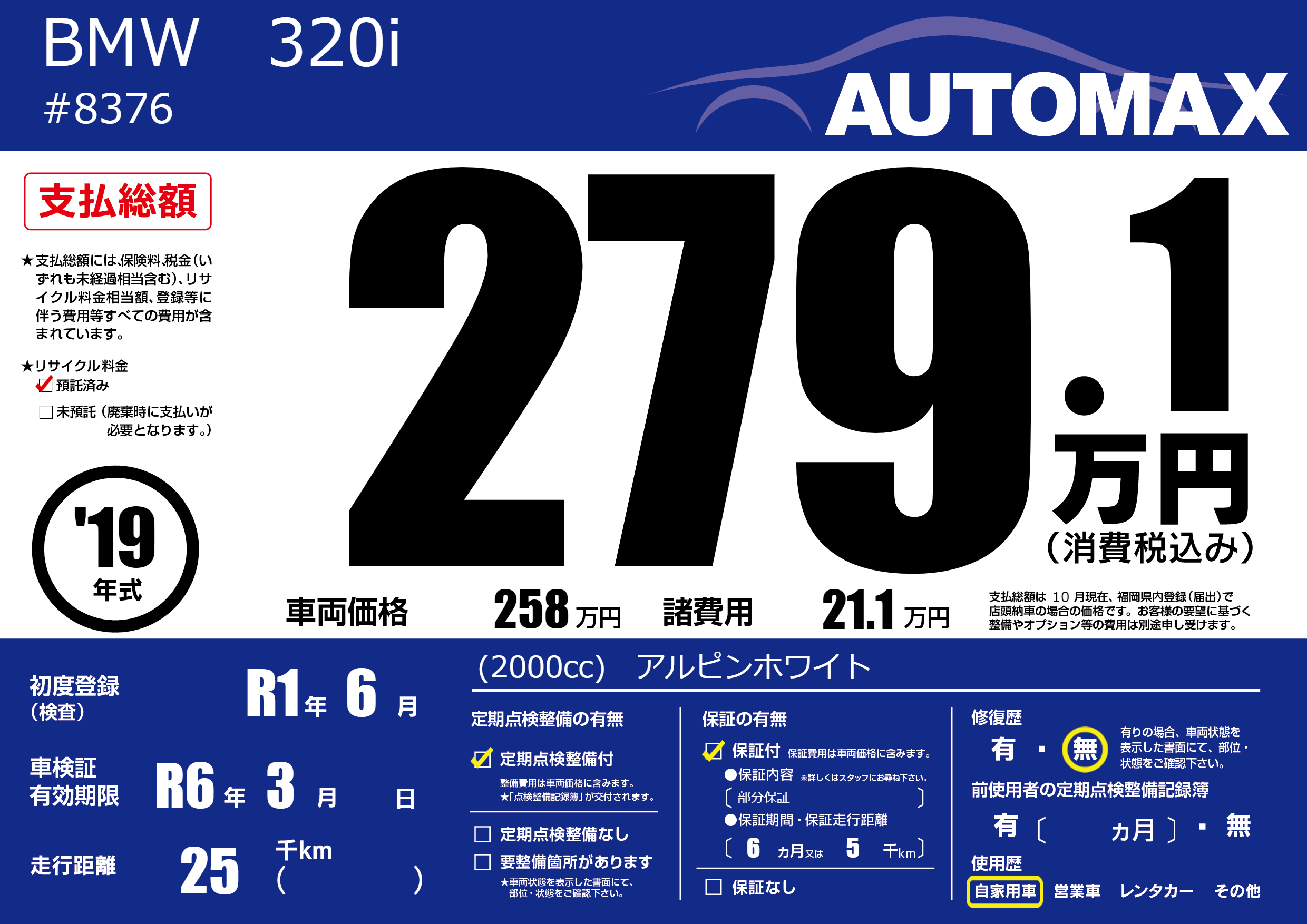 | 車名 | BMW 320i | グレード ミッション 排気量 |