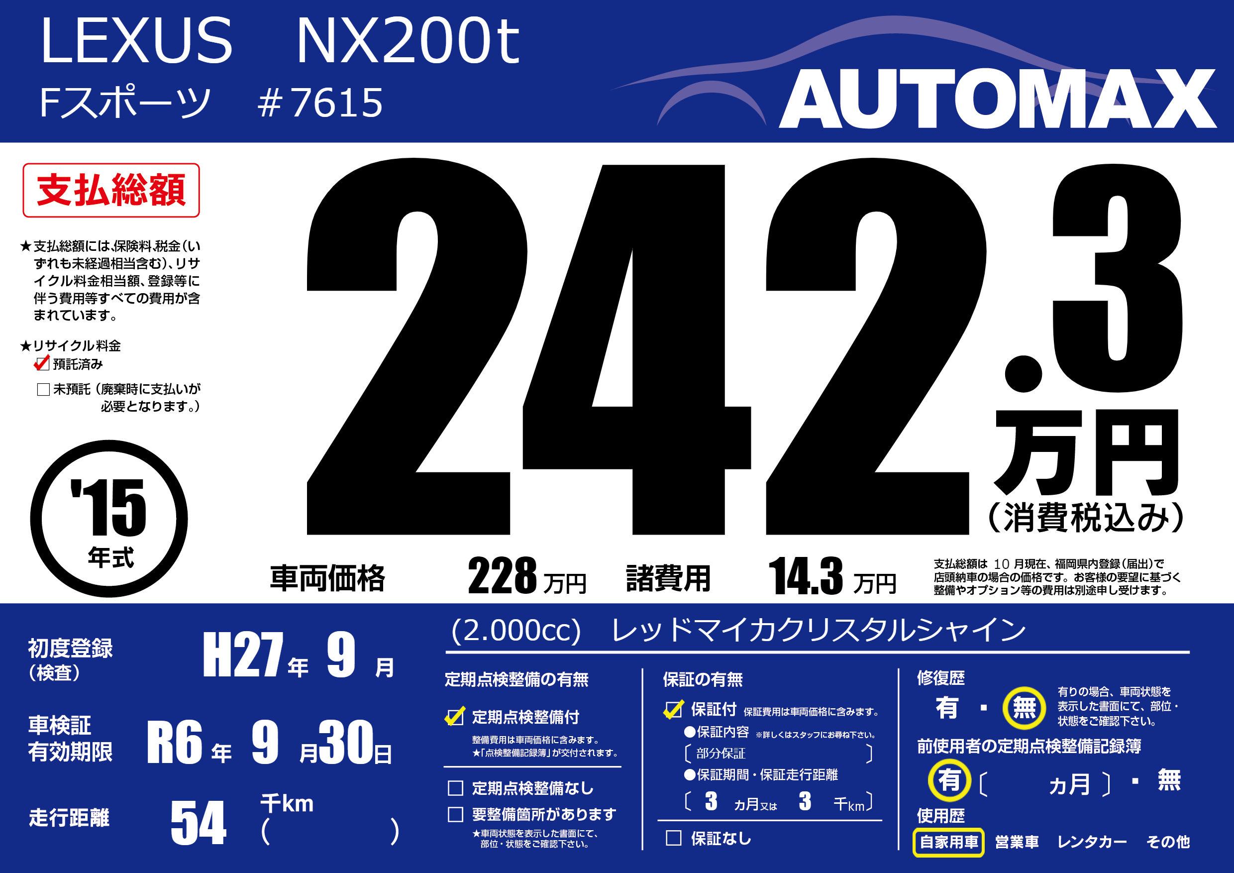 | 車名 | LEXUS NX200t | グレード ミッション 排気量 |