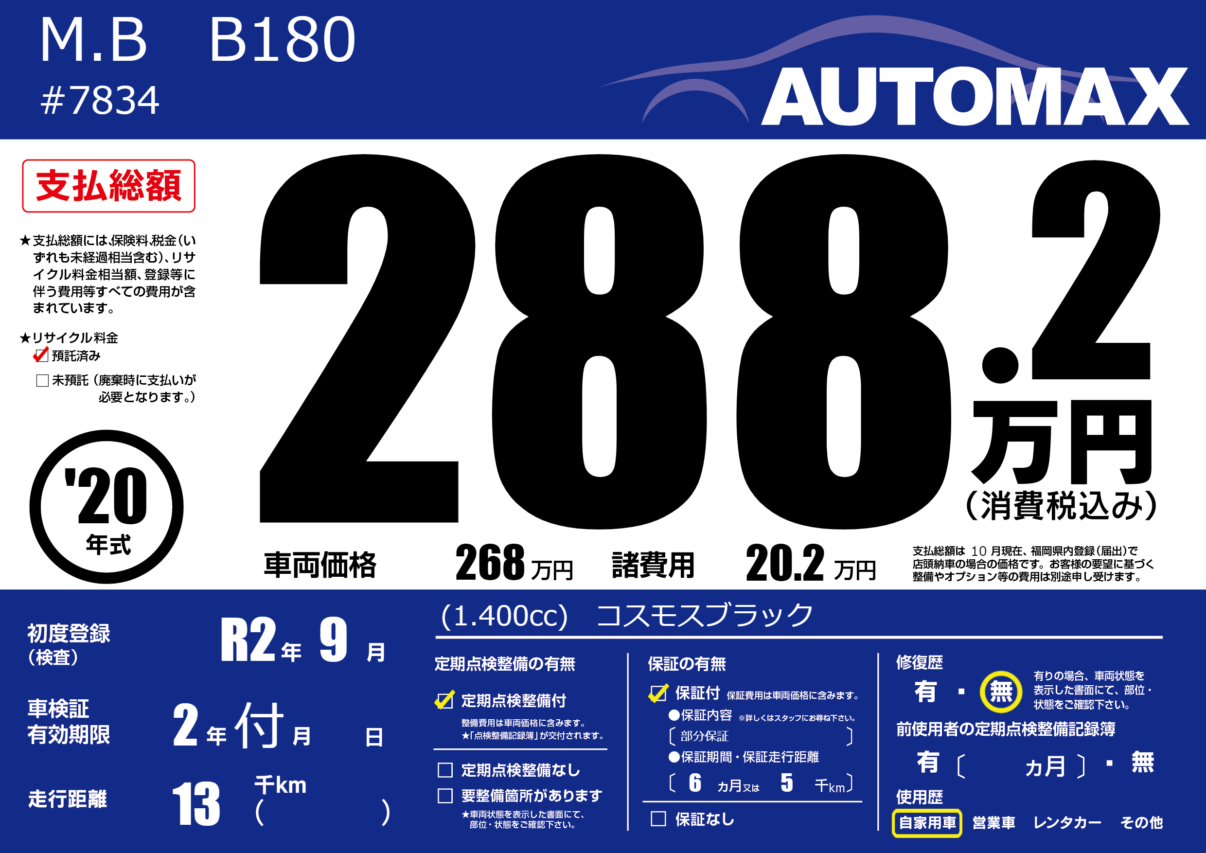 | 車名 | M.B B180 | グレード ミッション 排気量 |