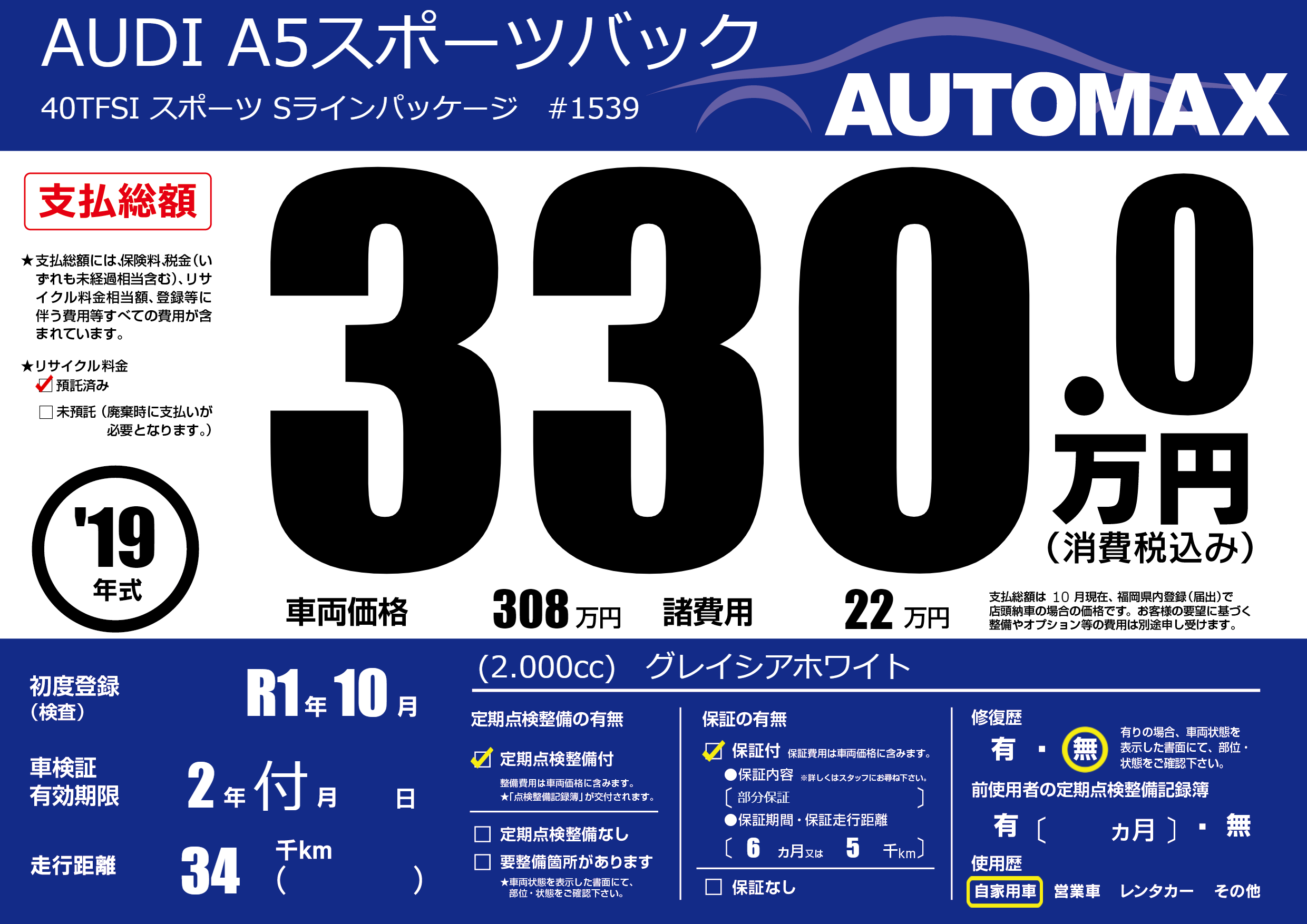 | 車名 | AUDI A5スポーツバック | グレード ミッション 排気量 |