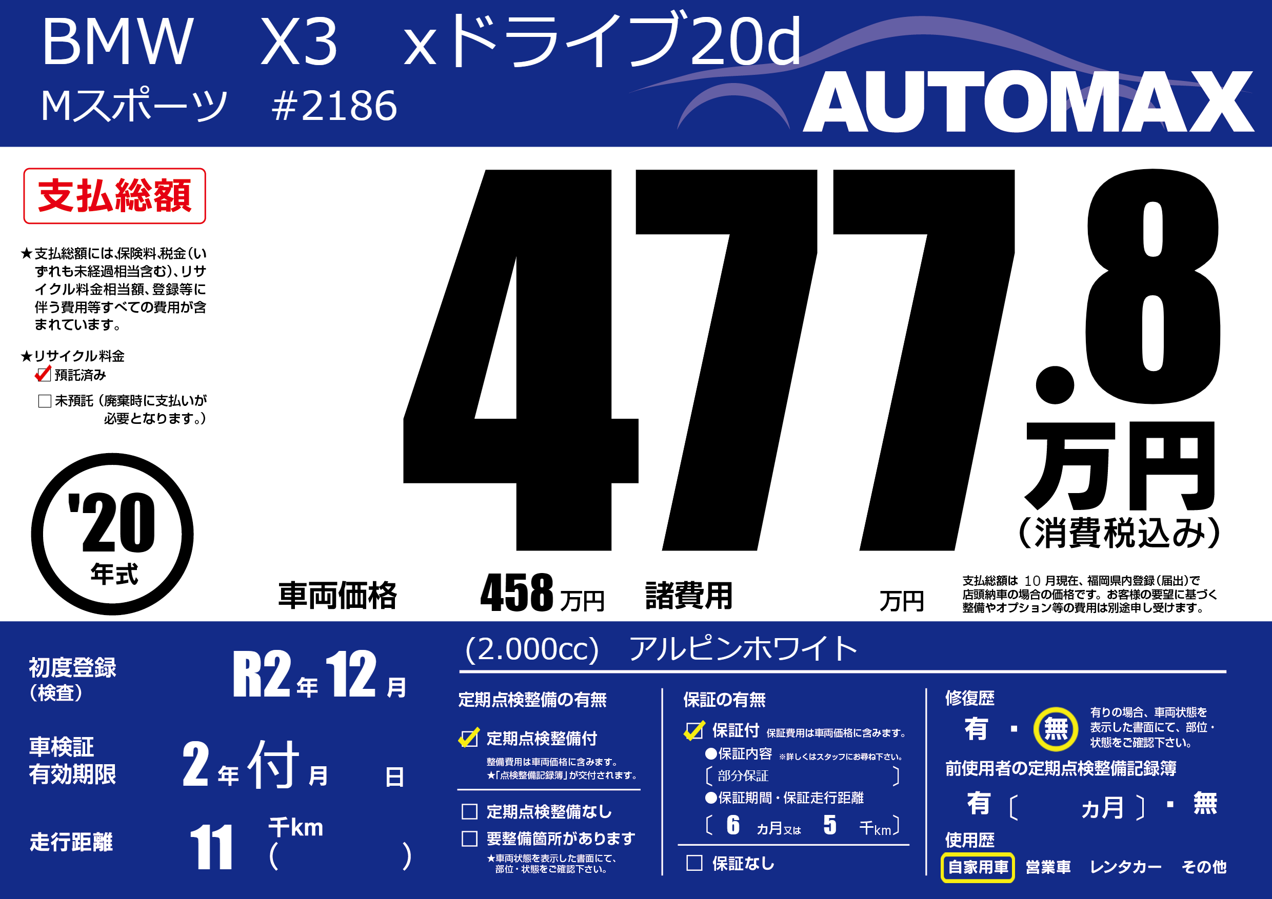 | 車名 | BMW X3 xドライブ20d | グレード ミッション 排気量 |