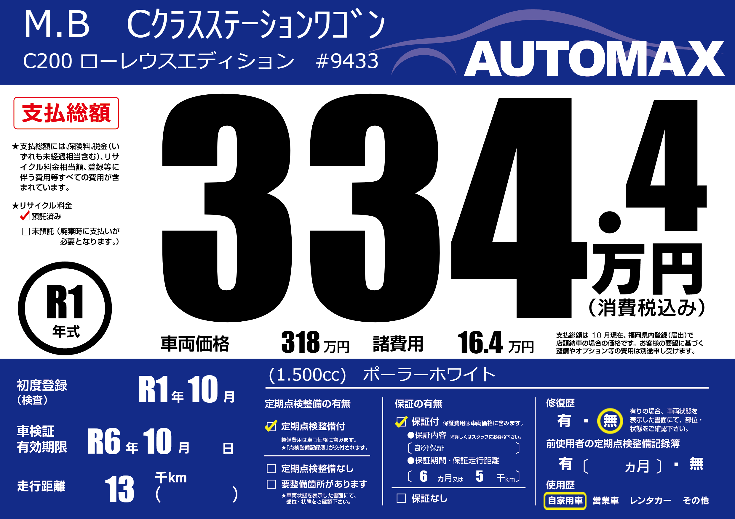 | 車名 | M.B Cクラスステーションワゴン | グレード ミッション 排気量 |