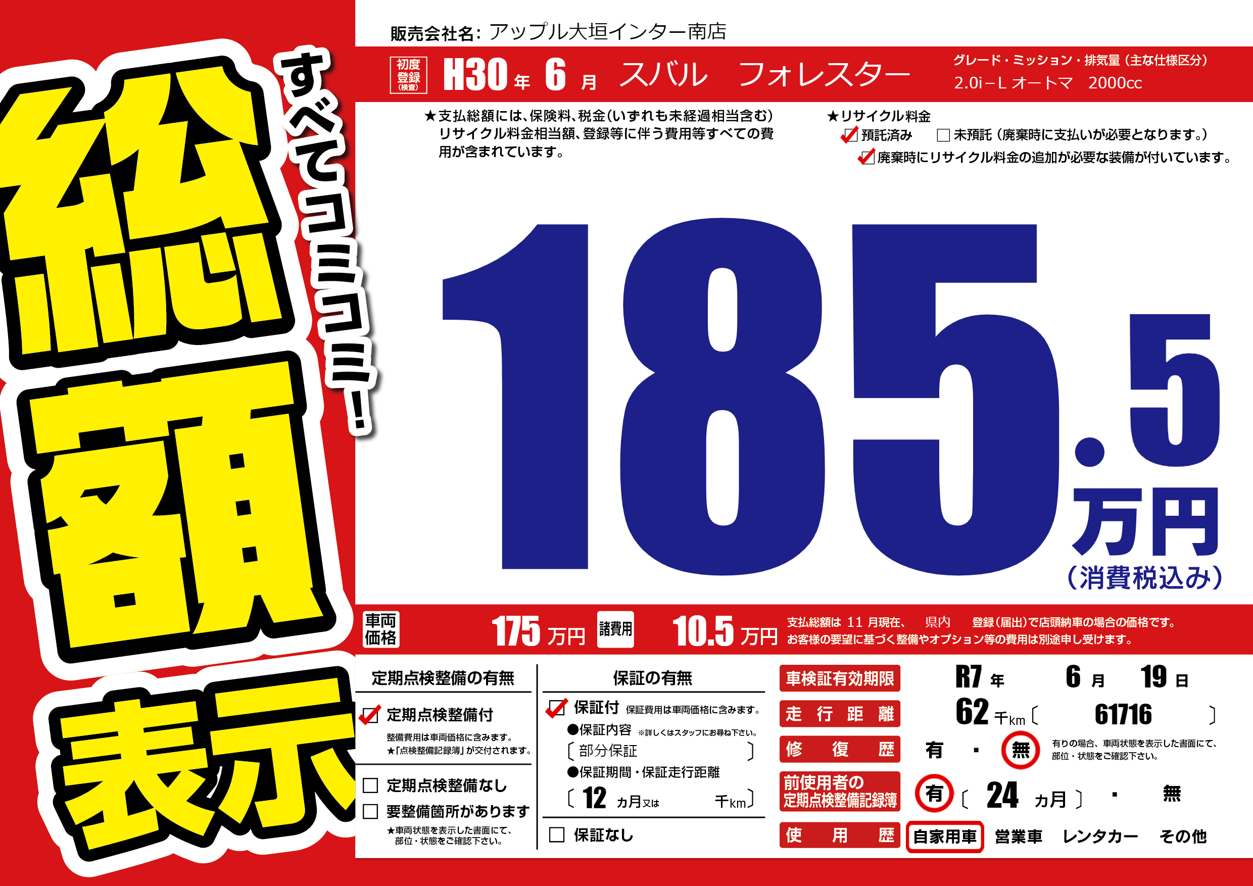 | 車名 | スバル フォレスター | グレード ミッション 排気量 |