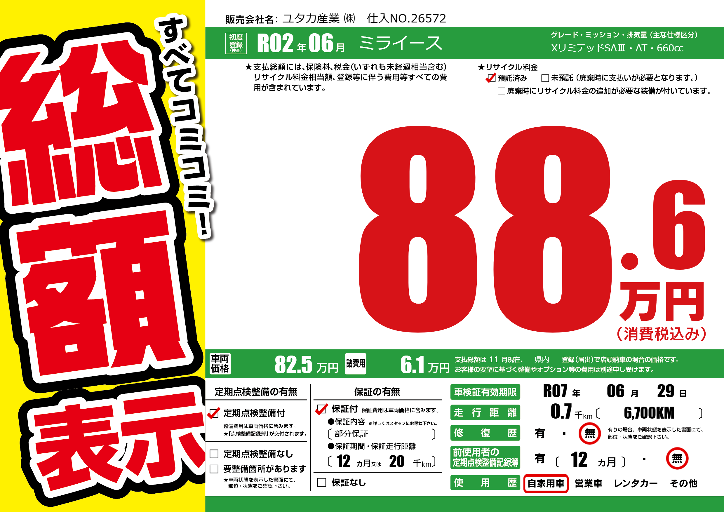 | 走行キロ | - | 初年度登録 | R02年06月 |