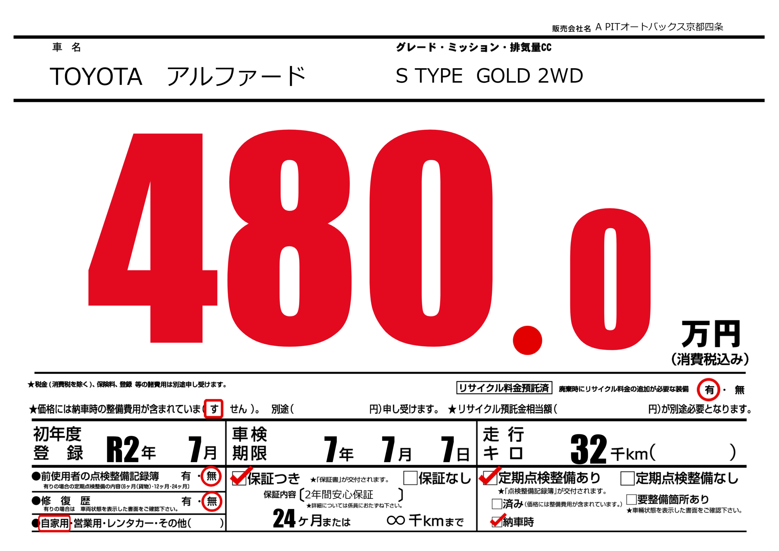 | 車名 | TOYOTA アルファード | グレード ミッション 排気量 |