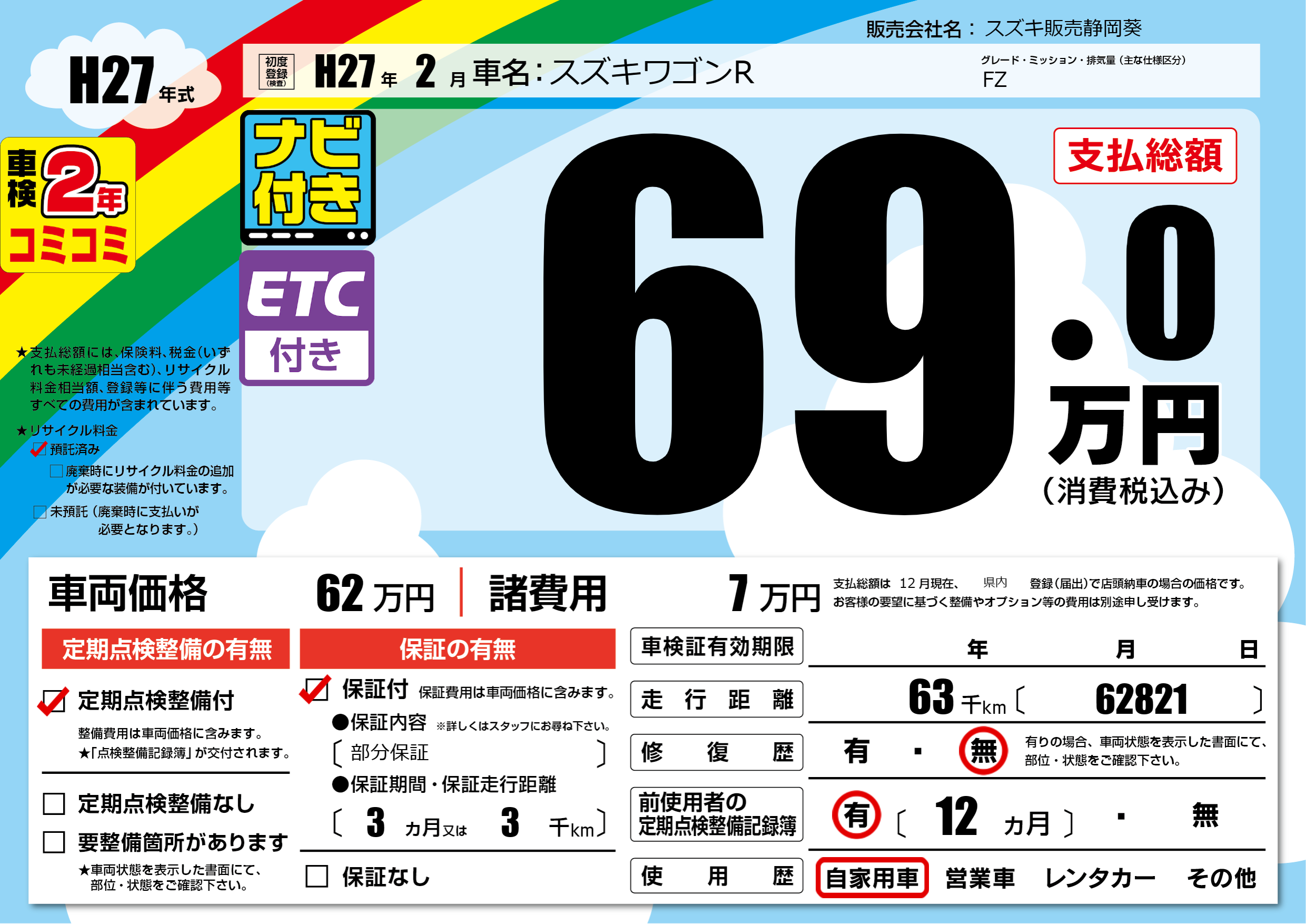 | 車名 | スズキワゴンR | グレード ミッション 排気量 |