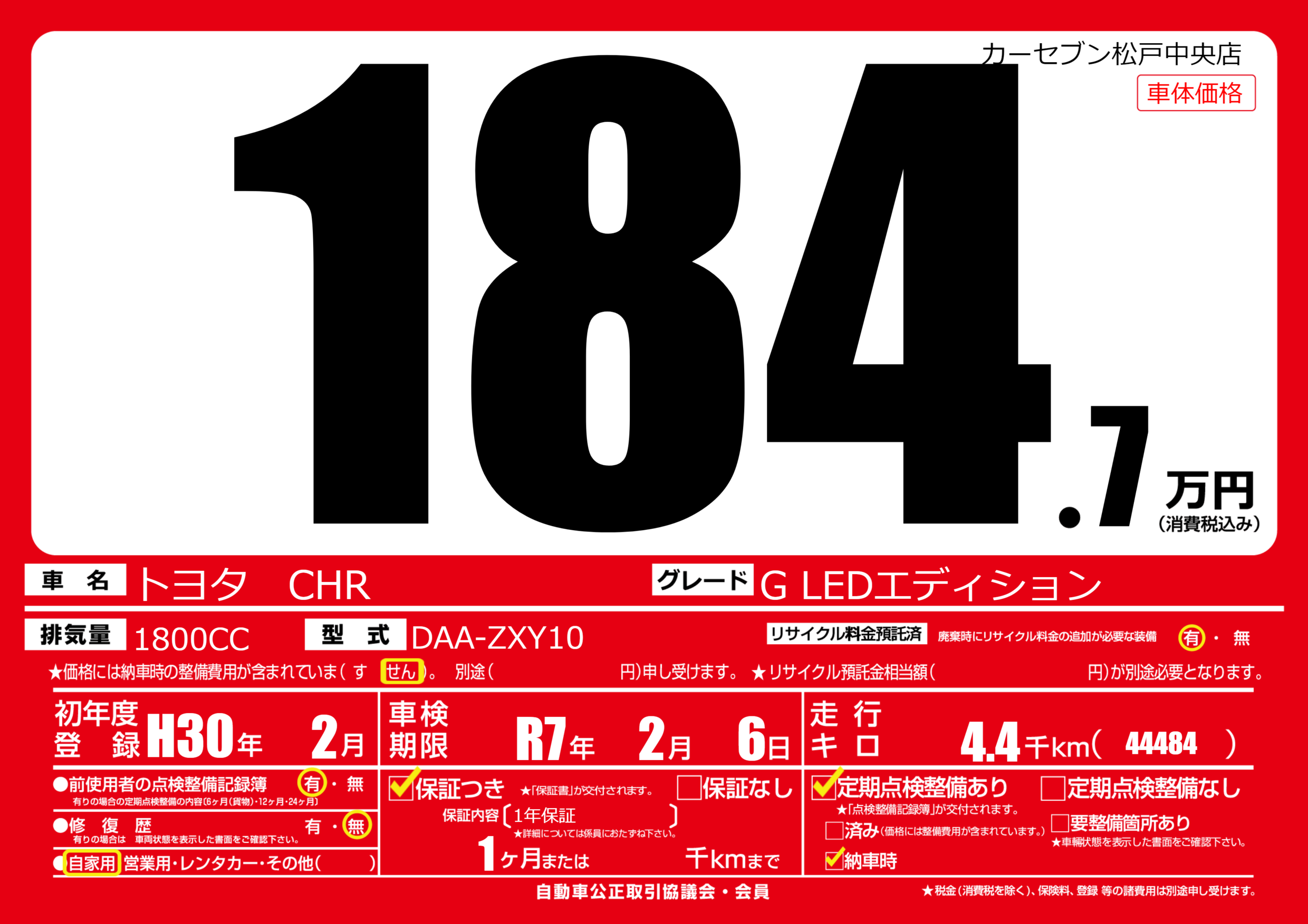 | 車名 | トヨタ CHR | グレード ミッション 排気量 |