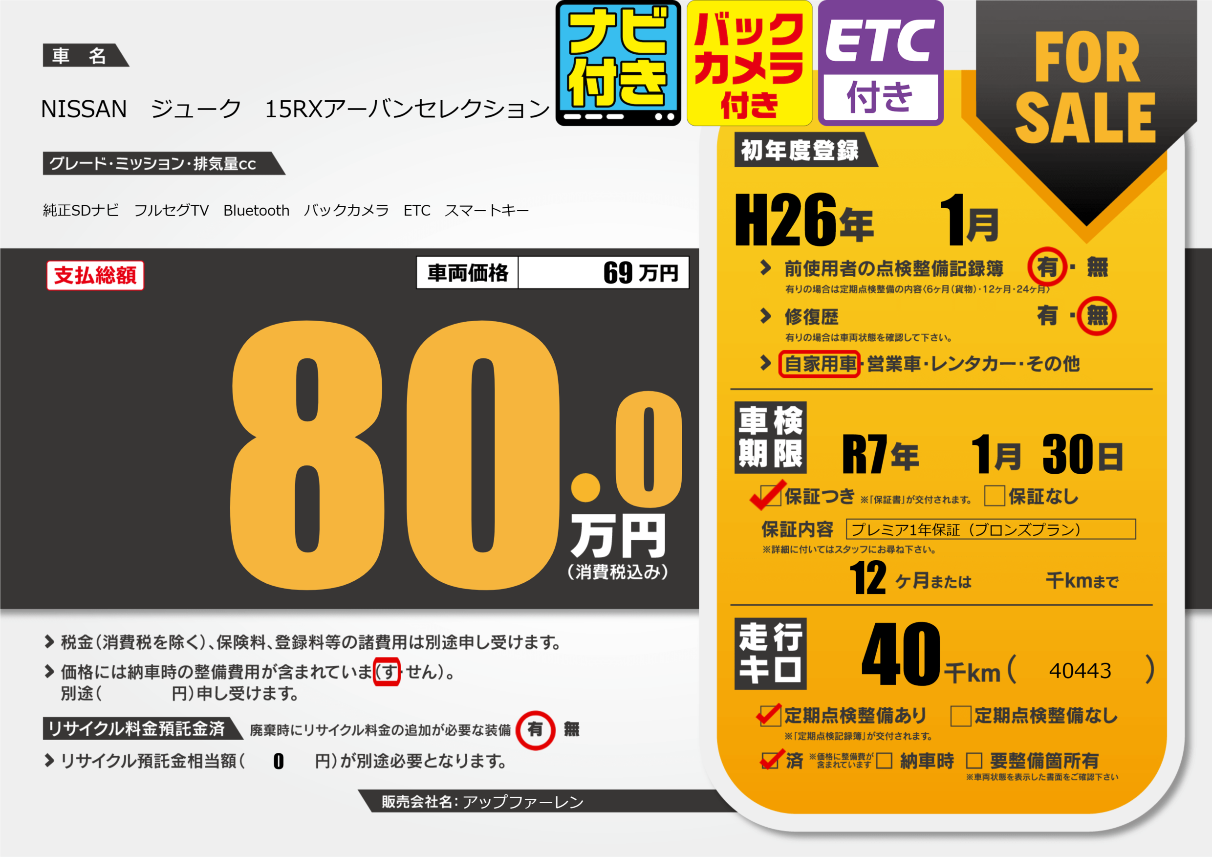 | 定期点検整備 | 定期点検整備あり 定期点検整備済み | ||