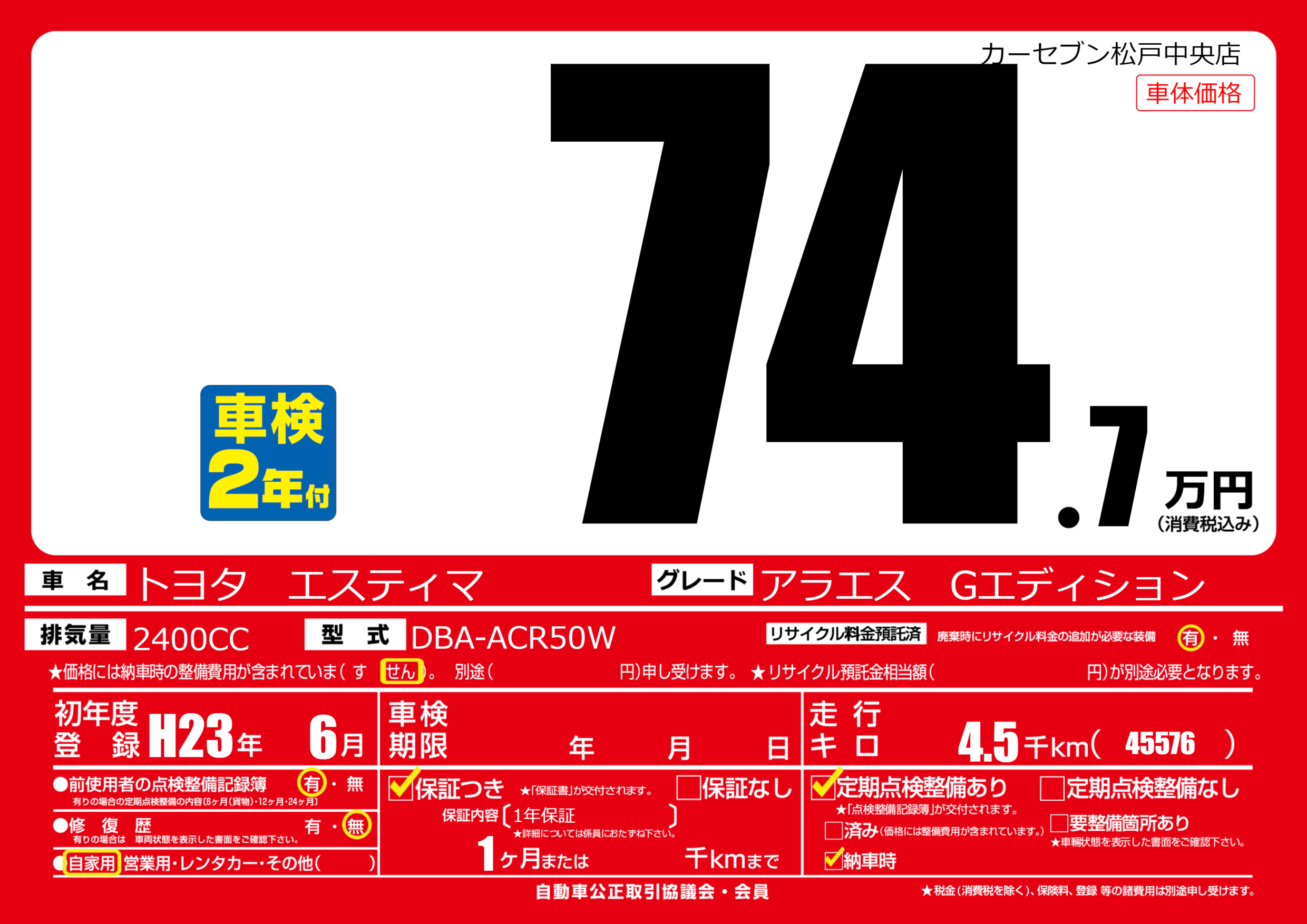 | 車名 | トヨタ エスティマ | グレード ミッション 排気量 |