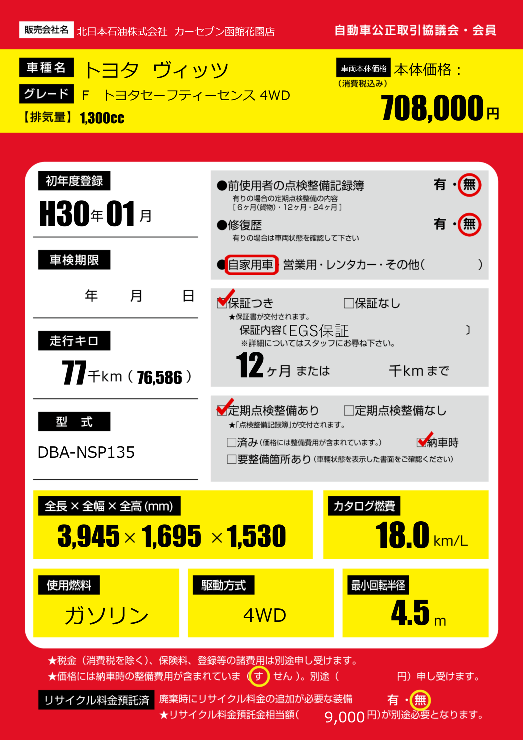| 車名 | トヨタ ヴィッツ | グレード ミッション 排気量 |