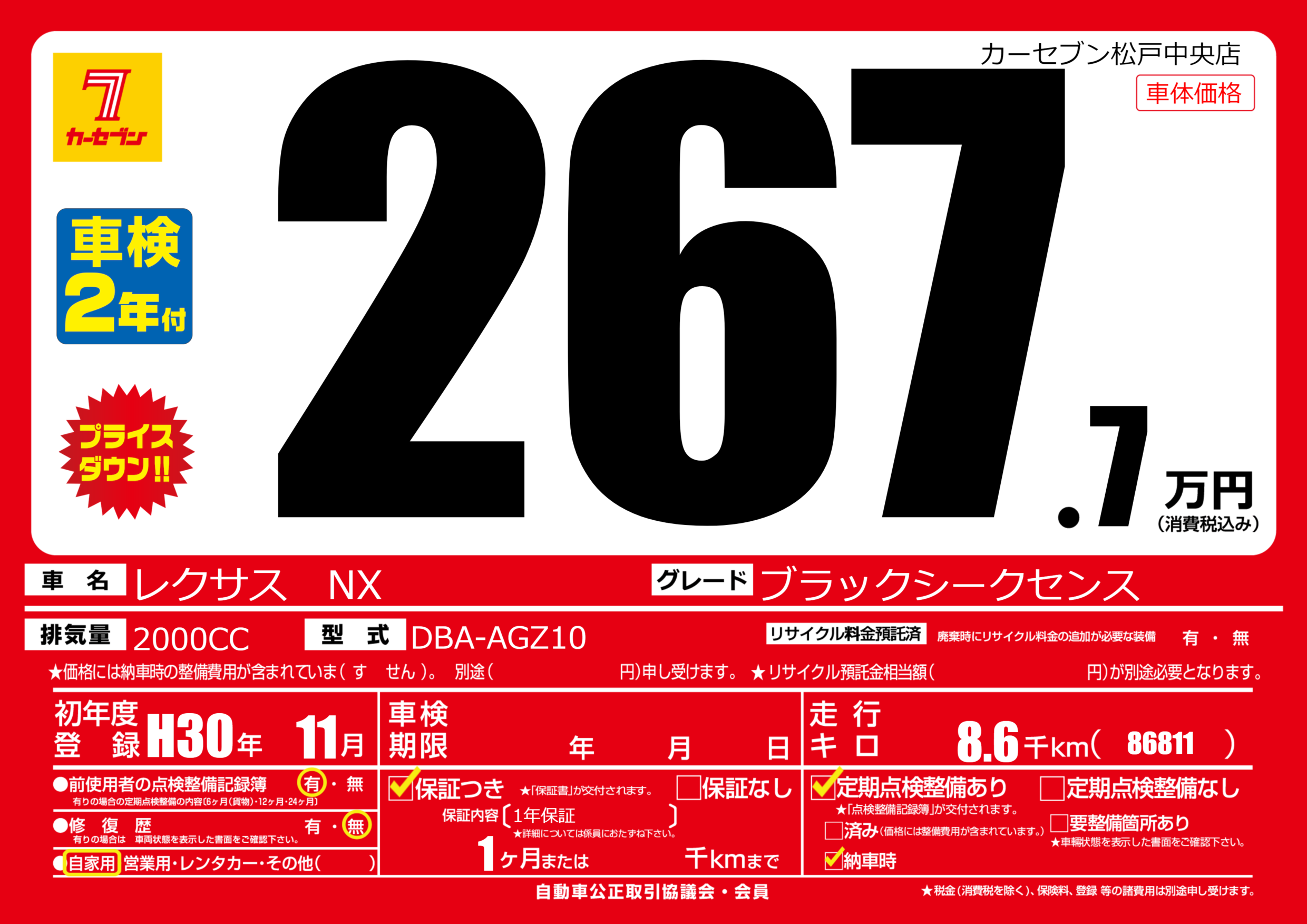| 走行キロ | 0.8万km | 初年度登録 | H30年11月 |