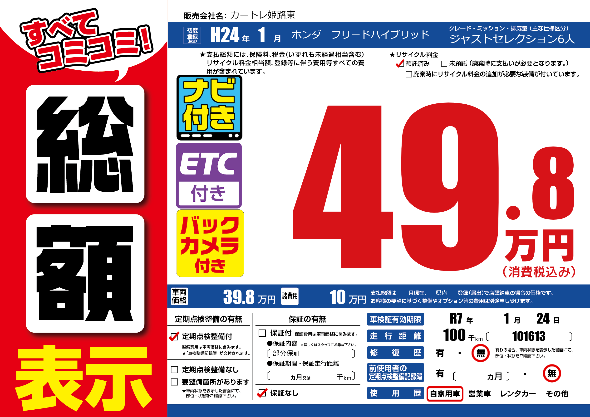 | 走行キロ | 10万km | 初年度登録 | H24年1月 |