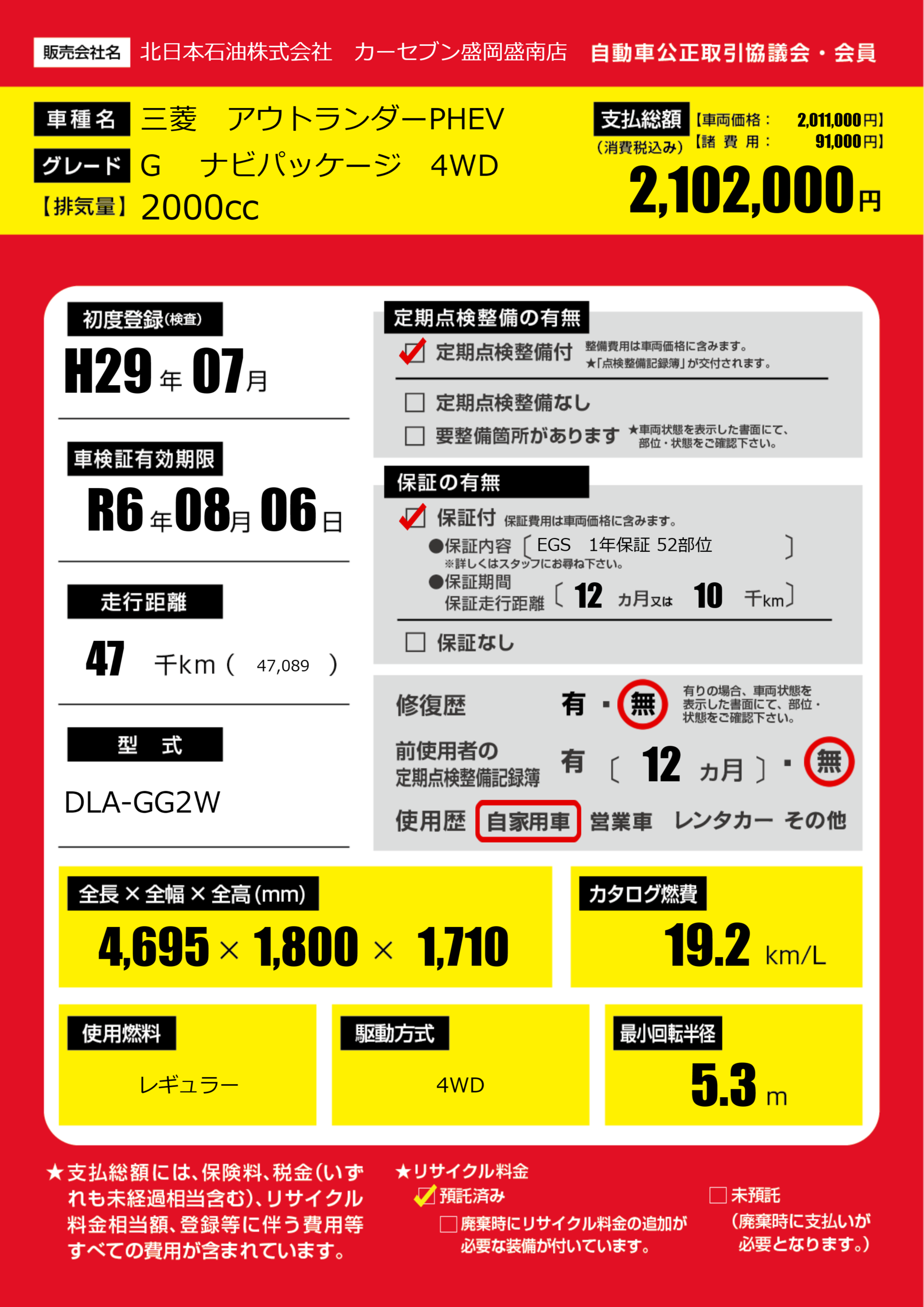 | 車名 | 三菱 アウトランダーPHEV | グレード ミッション 排気量 |