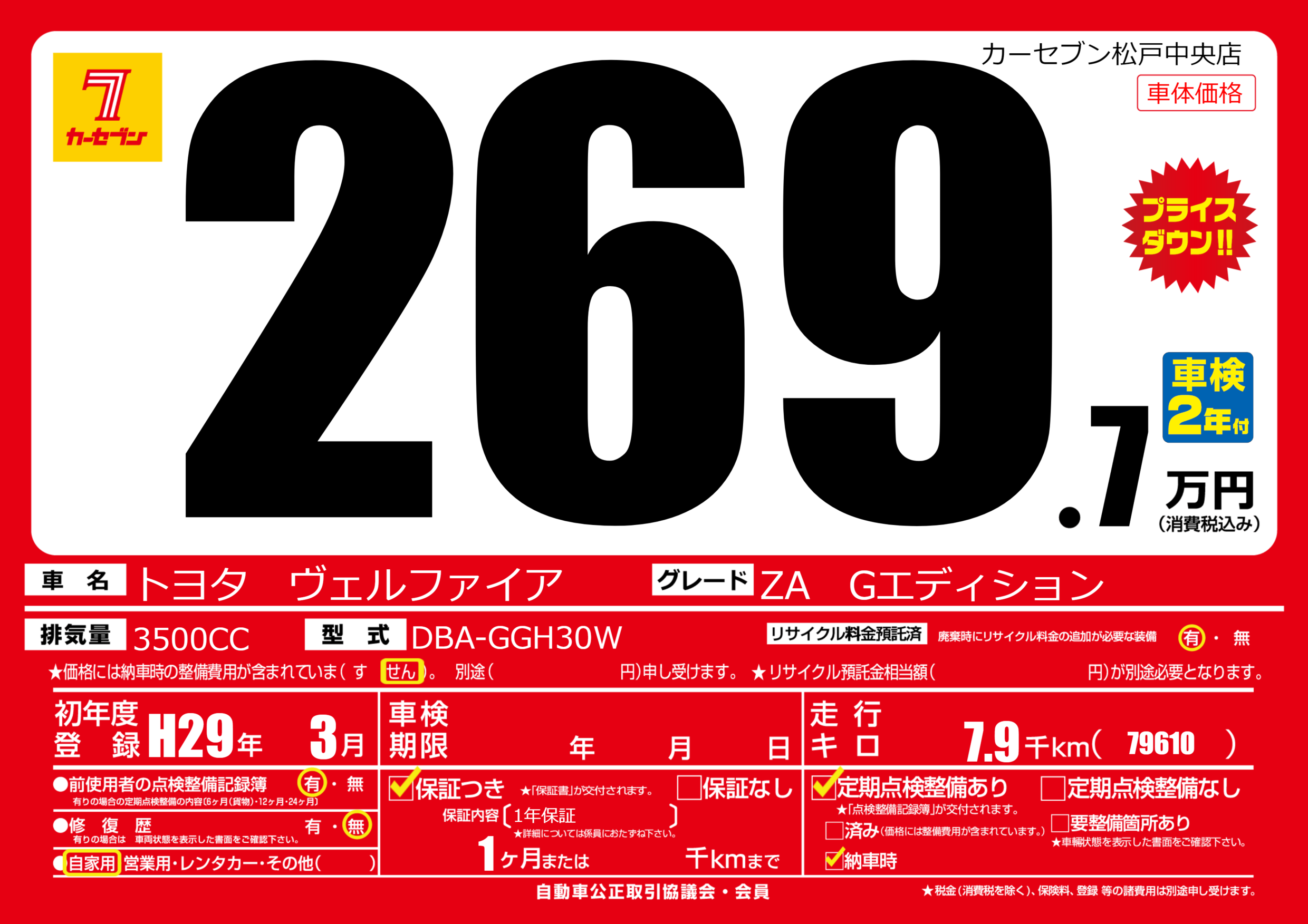 | 車名 | トヨタ ヴェルファイア | グレード ミッション 排気量 |