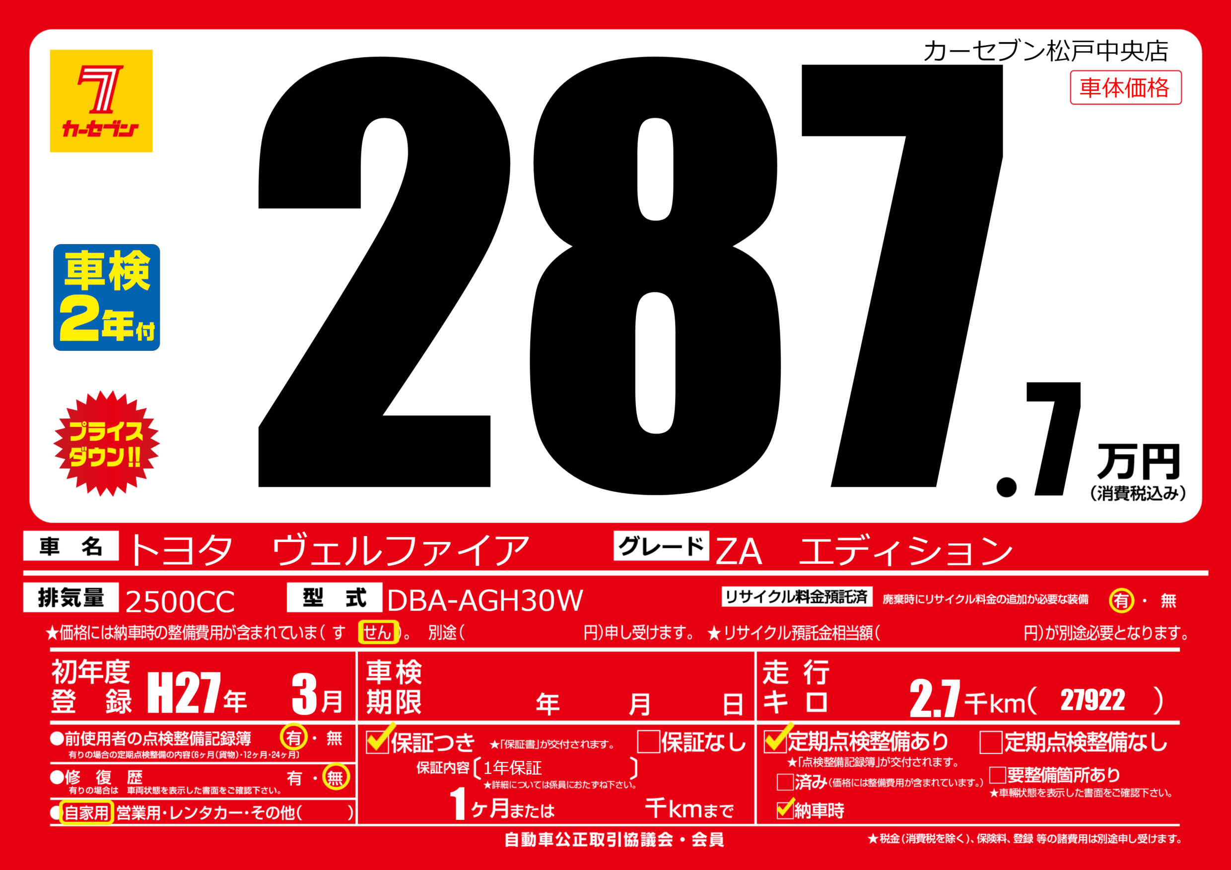 | 走行キロ | 0.2万km | 初年度登録 | H27年3月 |