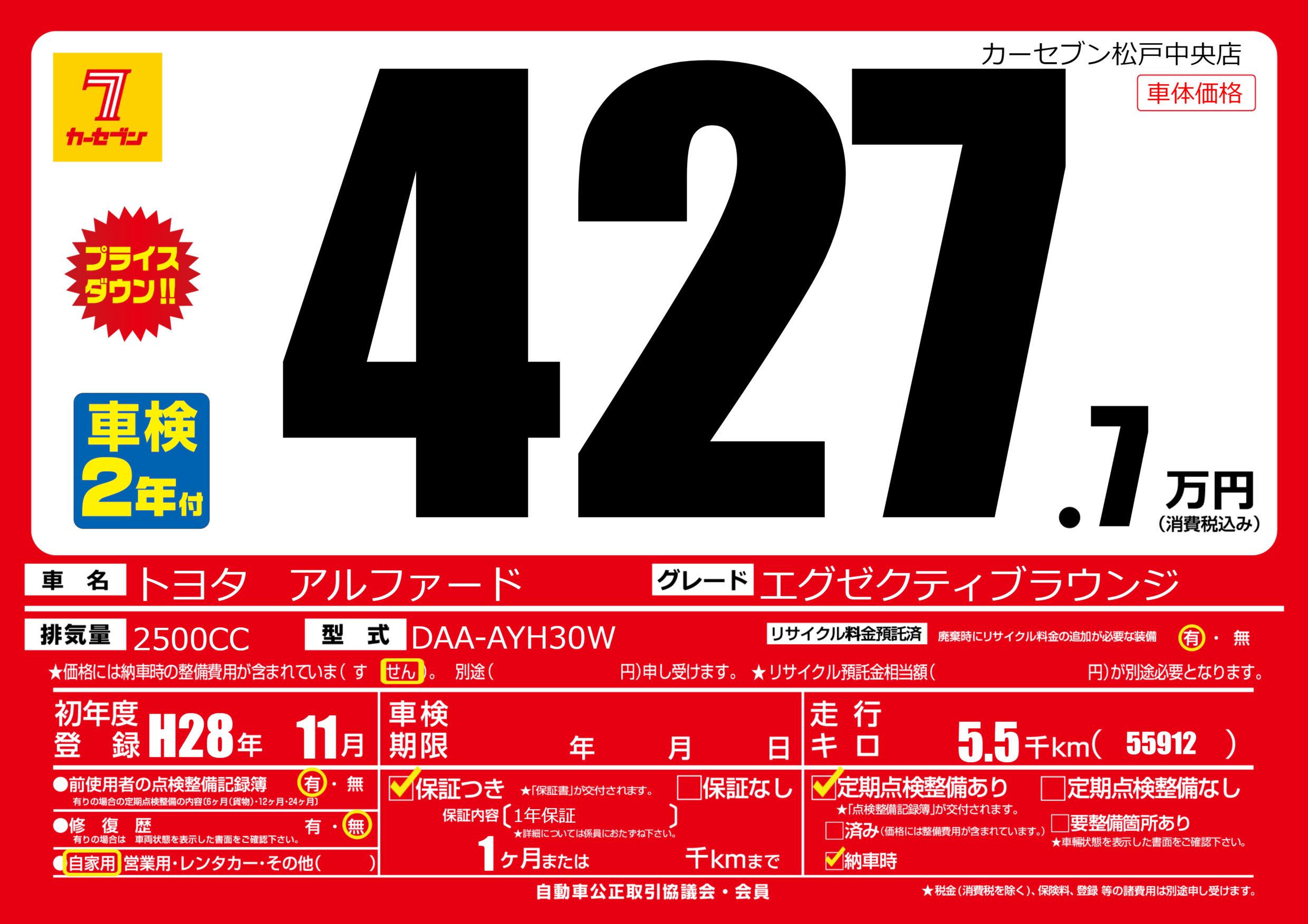 | 車名 | トヨタ アルファード | グレード ミッション 排気量 |
