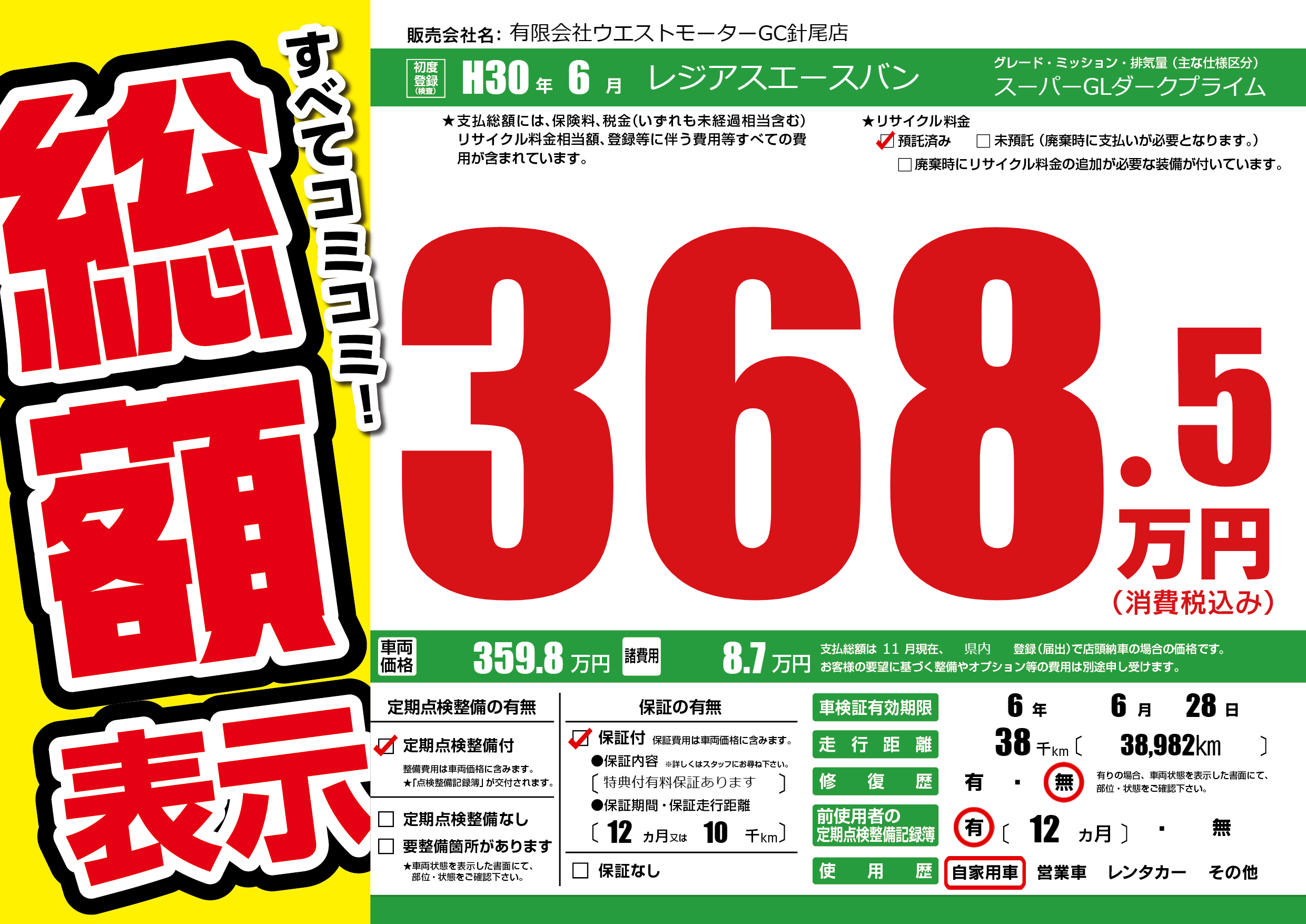 | 走行キロ | 3.8万km | 初年度登録 | H30年6月 |