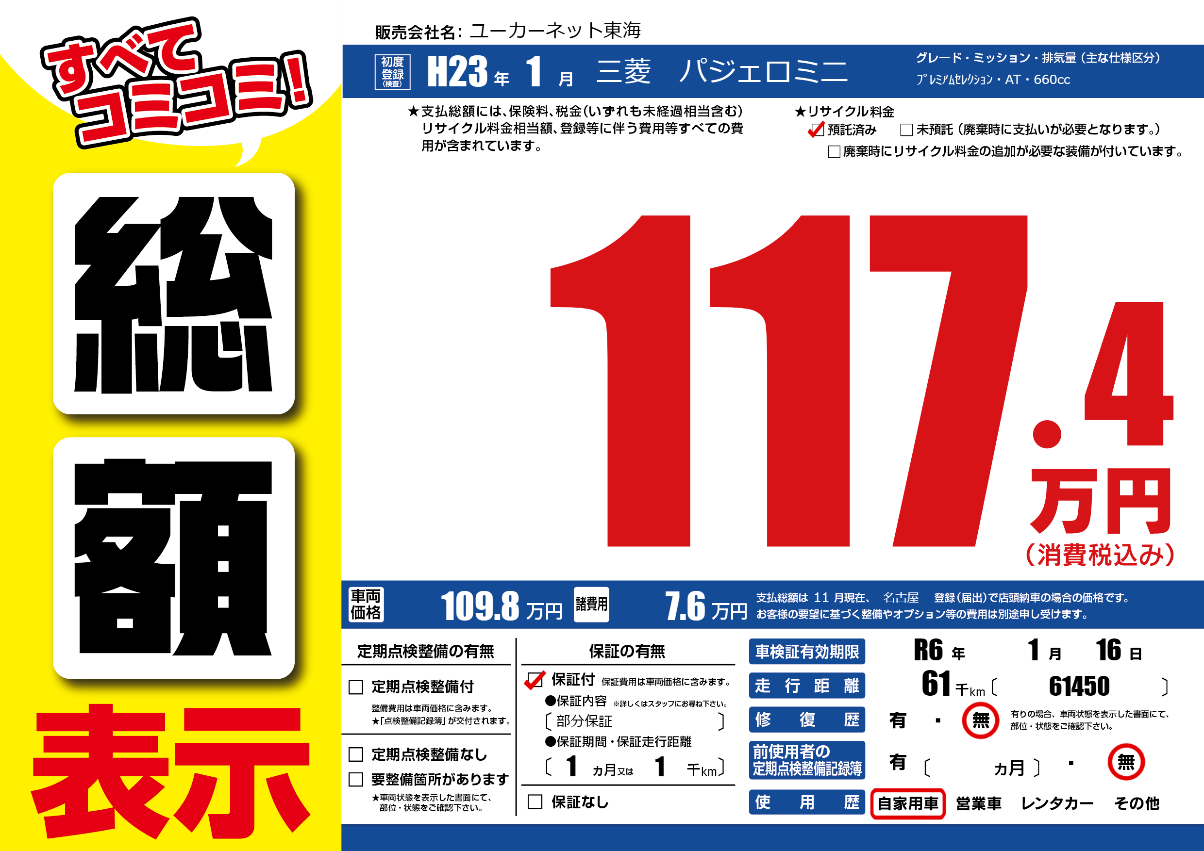 | 車名 | 三菱 パジェロミニ | グレード ミッション 排気量 |