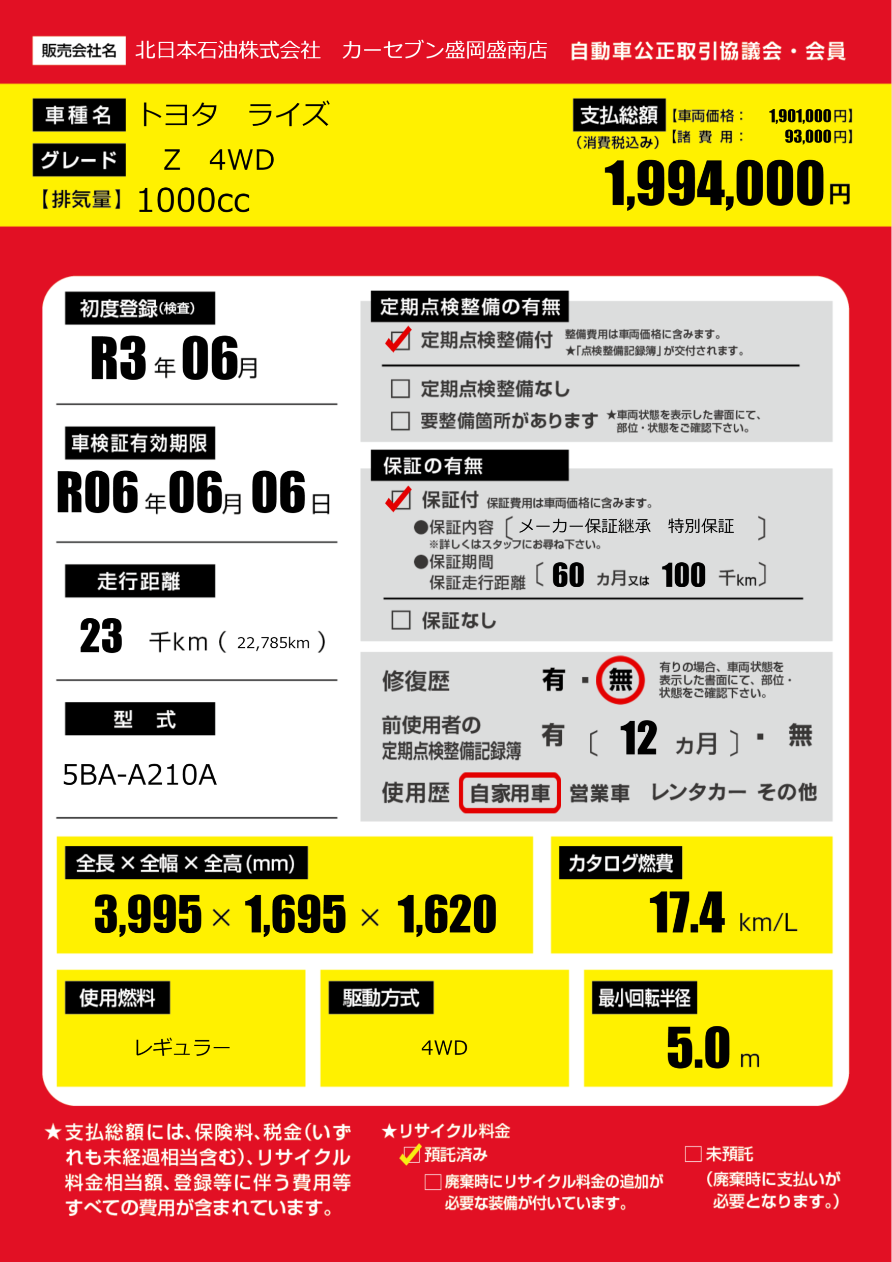 | 車名 | トヨタ ライズ | グレード ミッション 排気量 |