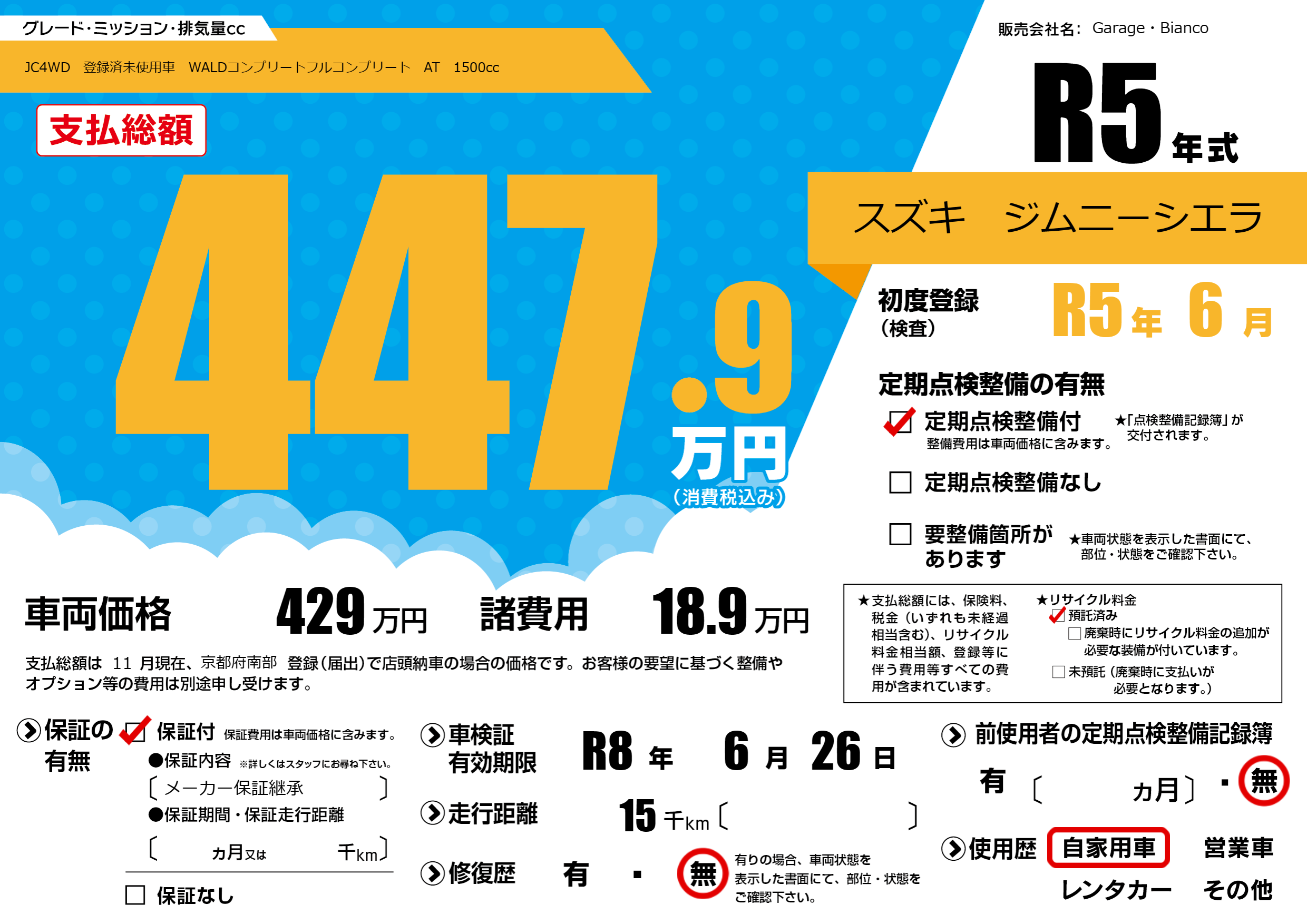 | 車名 | スズキ ジムニーシエラ | グレード ミッション 排気量 |