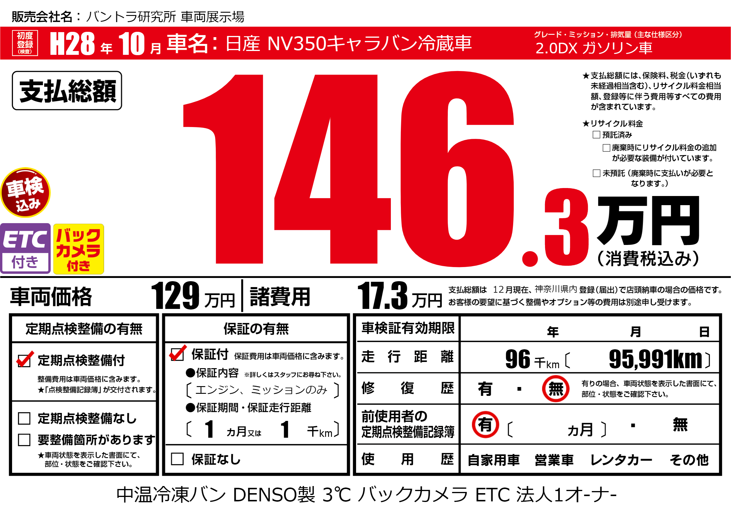 | 車名 | 日産 NV350キャラバン冷蔵車 | グレード ミッション 排気量 |