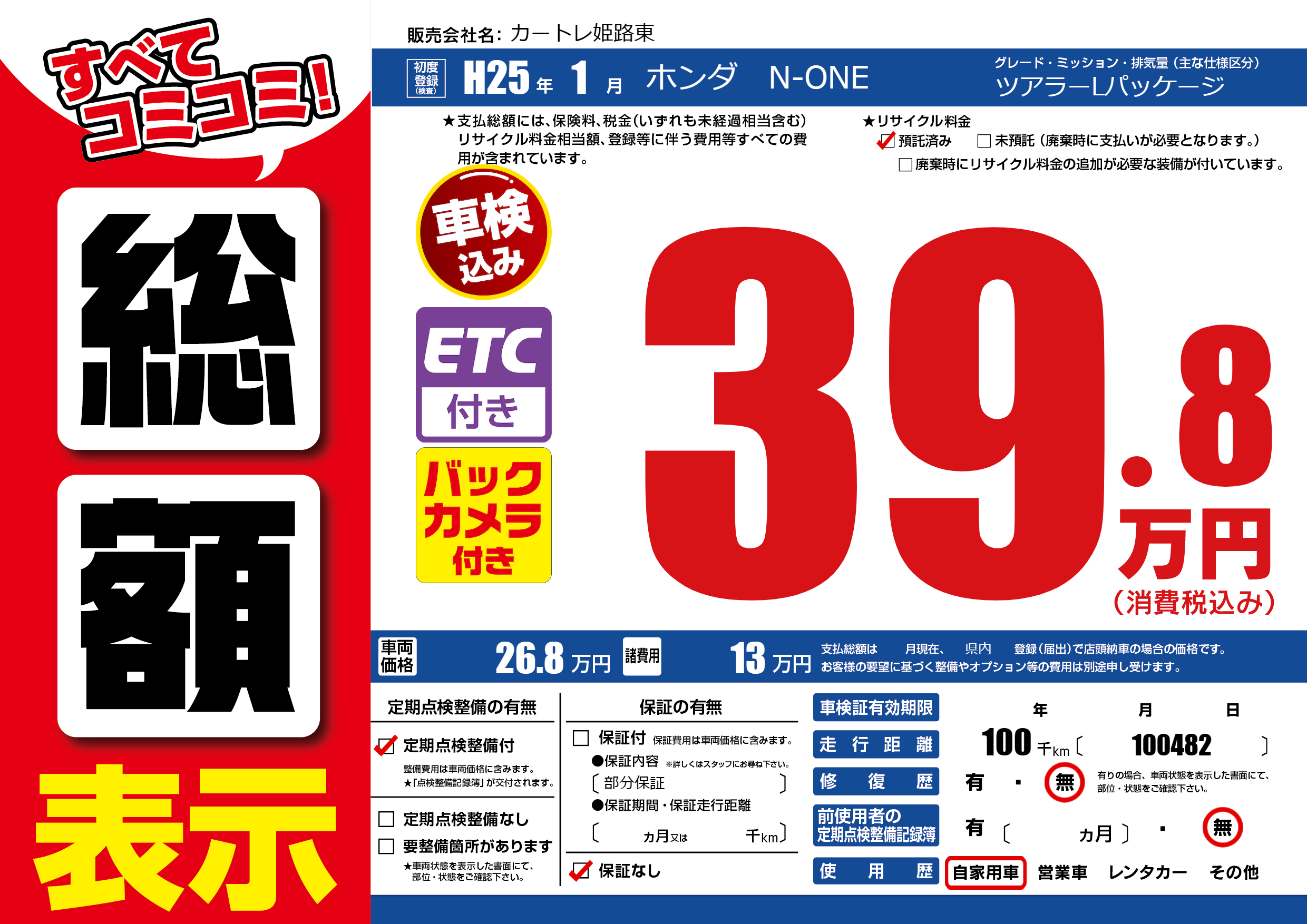 | 車名 | ホンダ N-ONE | グレード ミッション 排気量 |