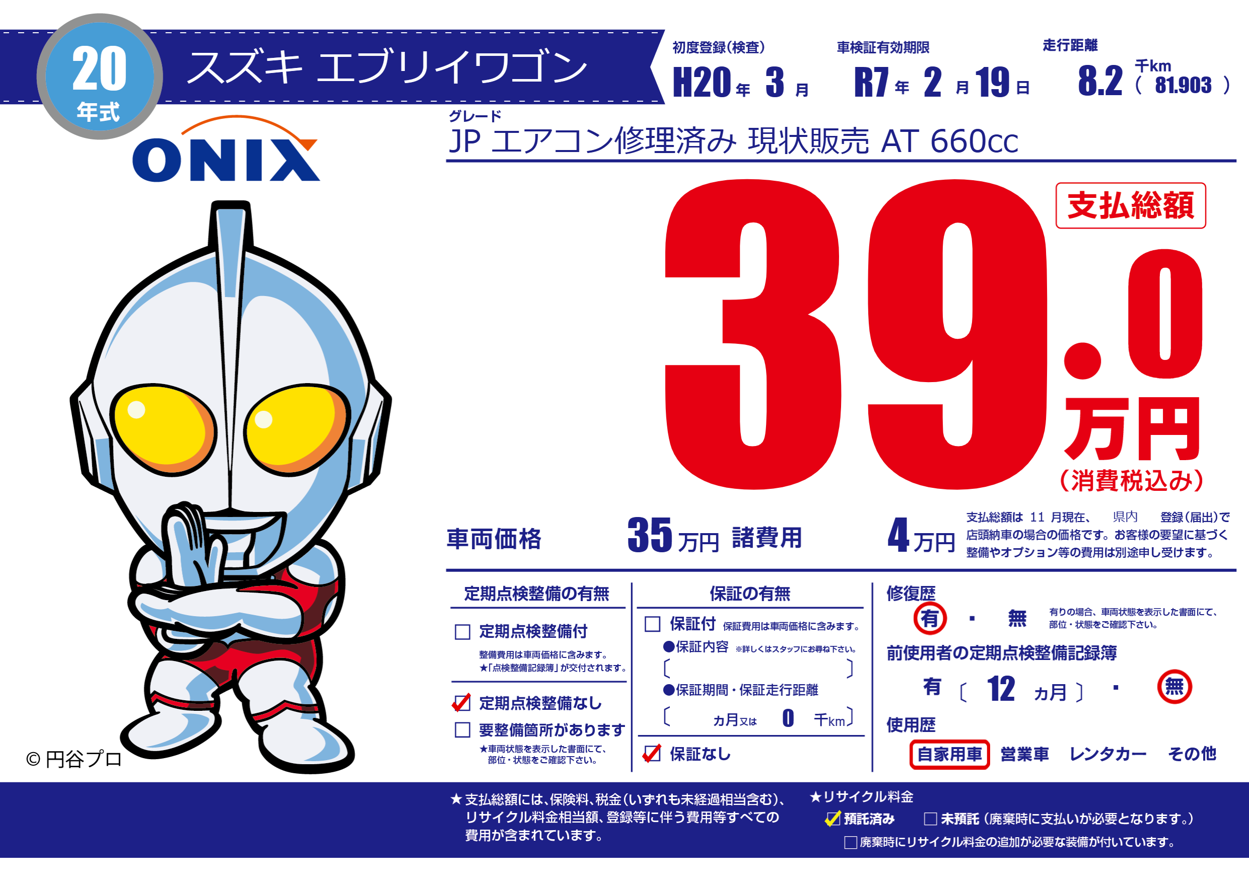 | 車名 | スズキ エブリイワゴン | グレード ミッション 排気量 |