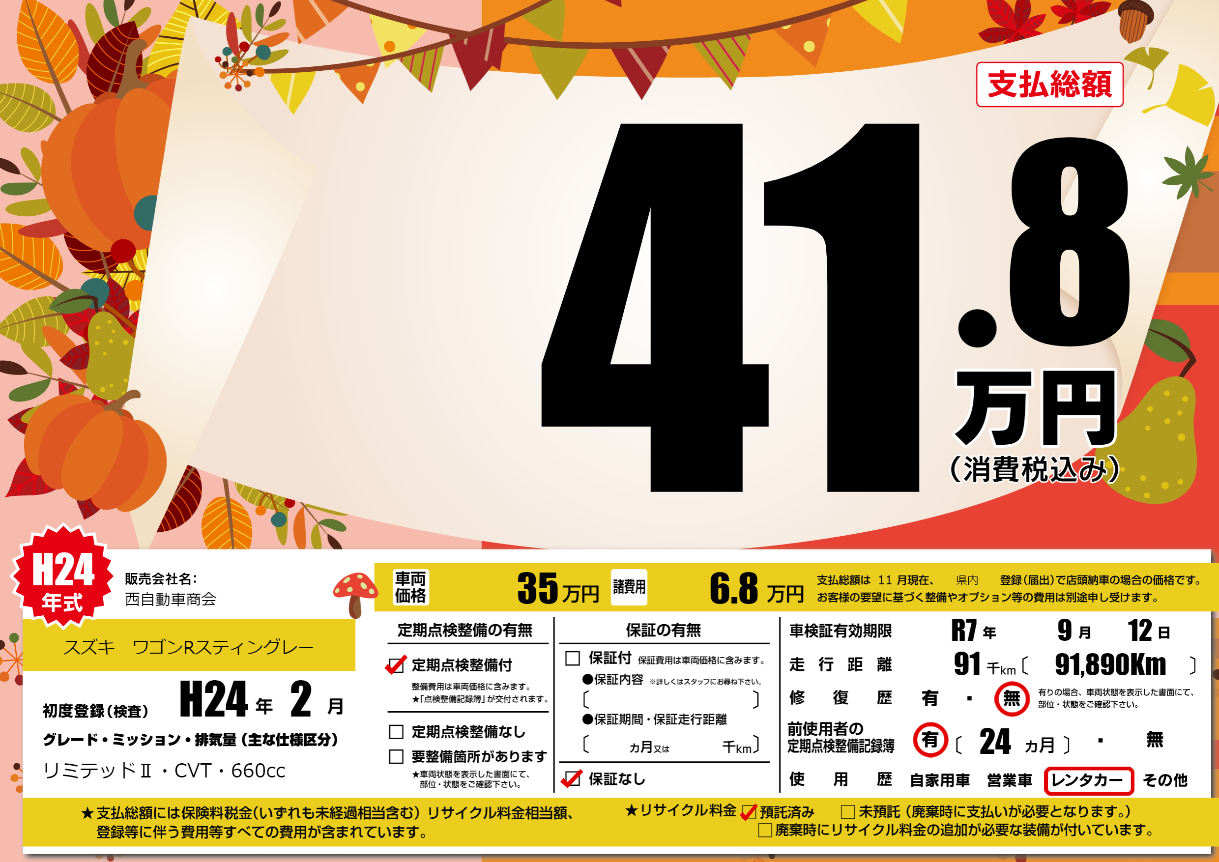 | 走行キロ | 9.1万km | 初年度登録 | H24年2月 |