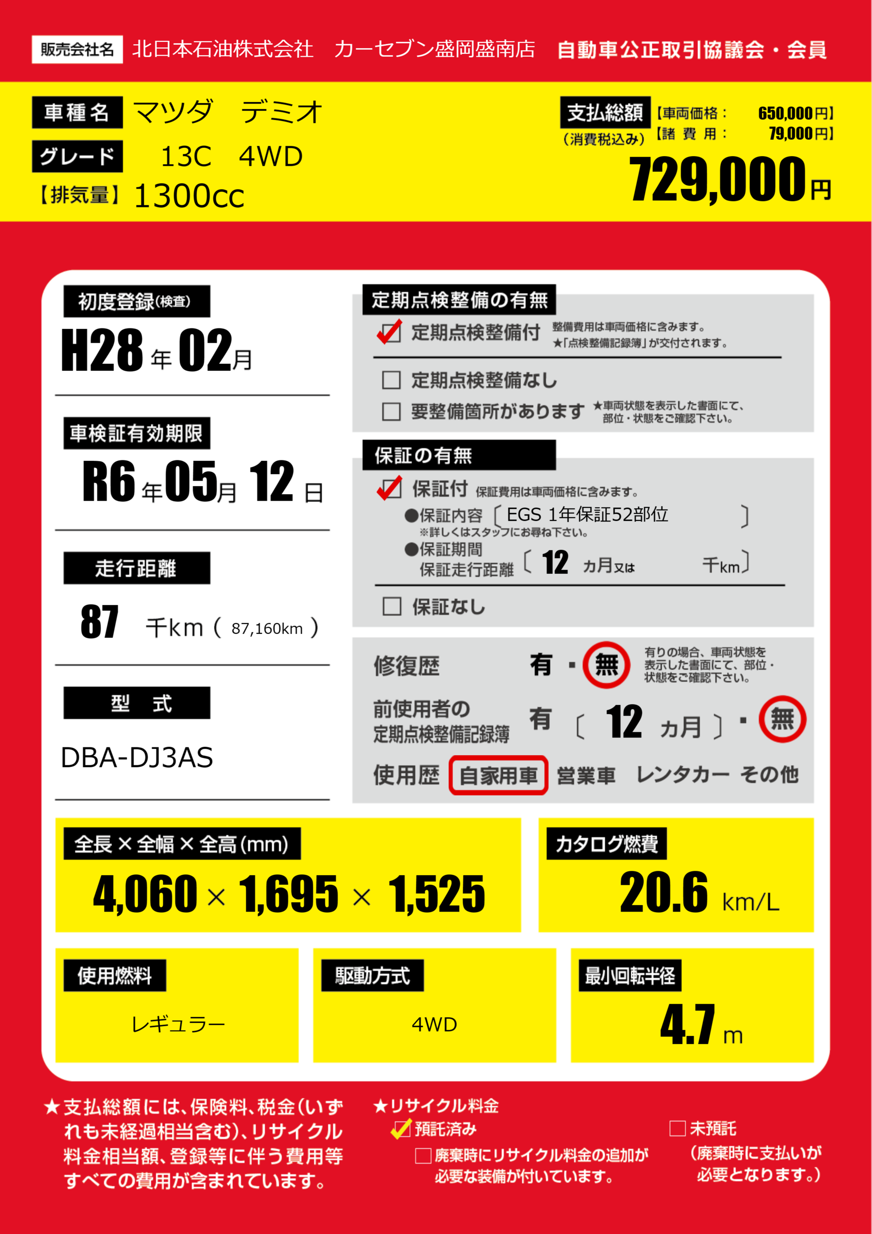 | 車名 | マツダ デミオ | グレード ミッション 排気量 |