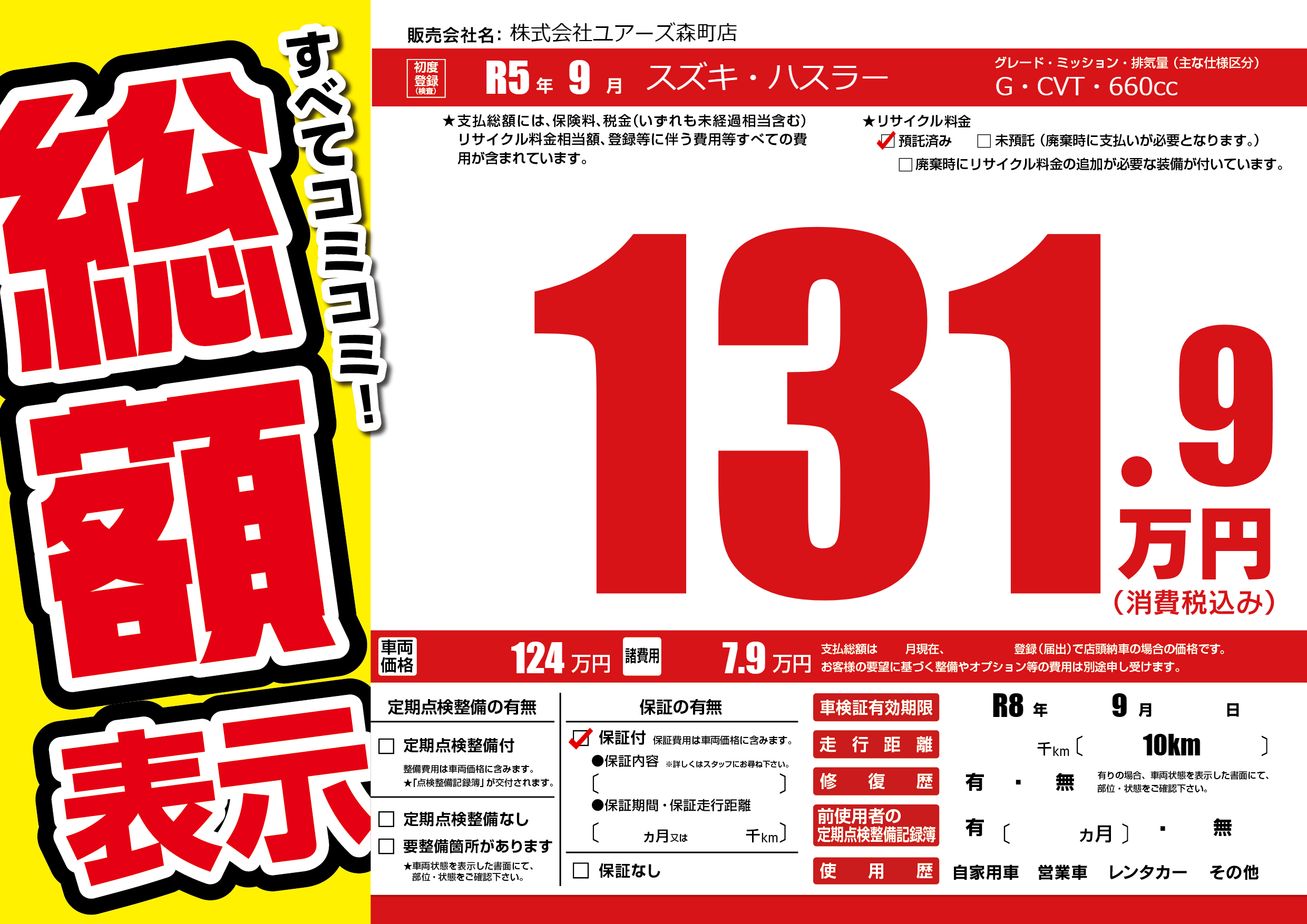 | 車名 | スズキ・ハスラー | グレード ミッション 排気量 |