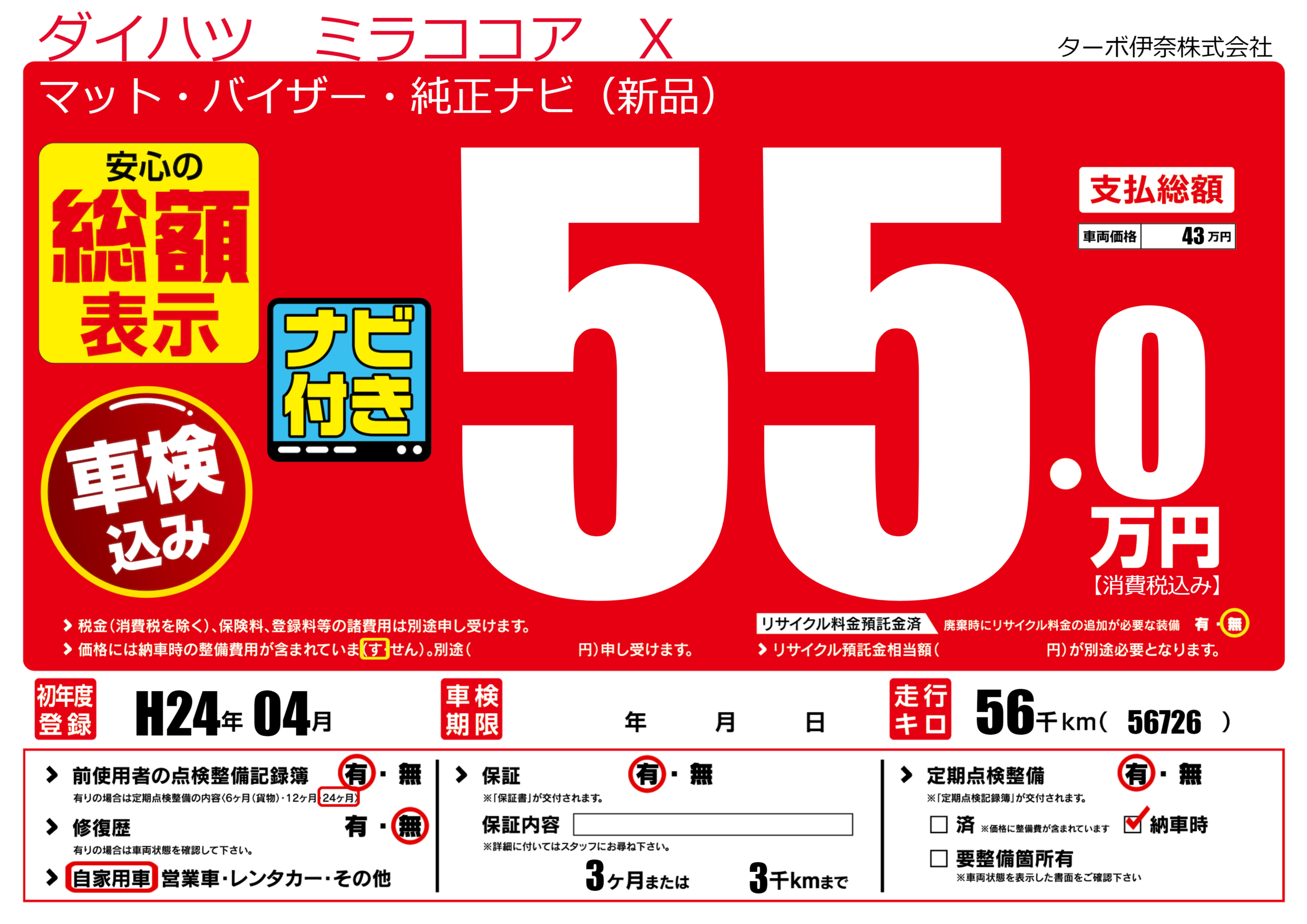 | 走行キロ | 5.6万km | 初年度登録 | H24年04月 |