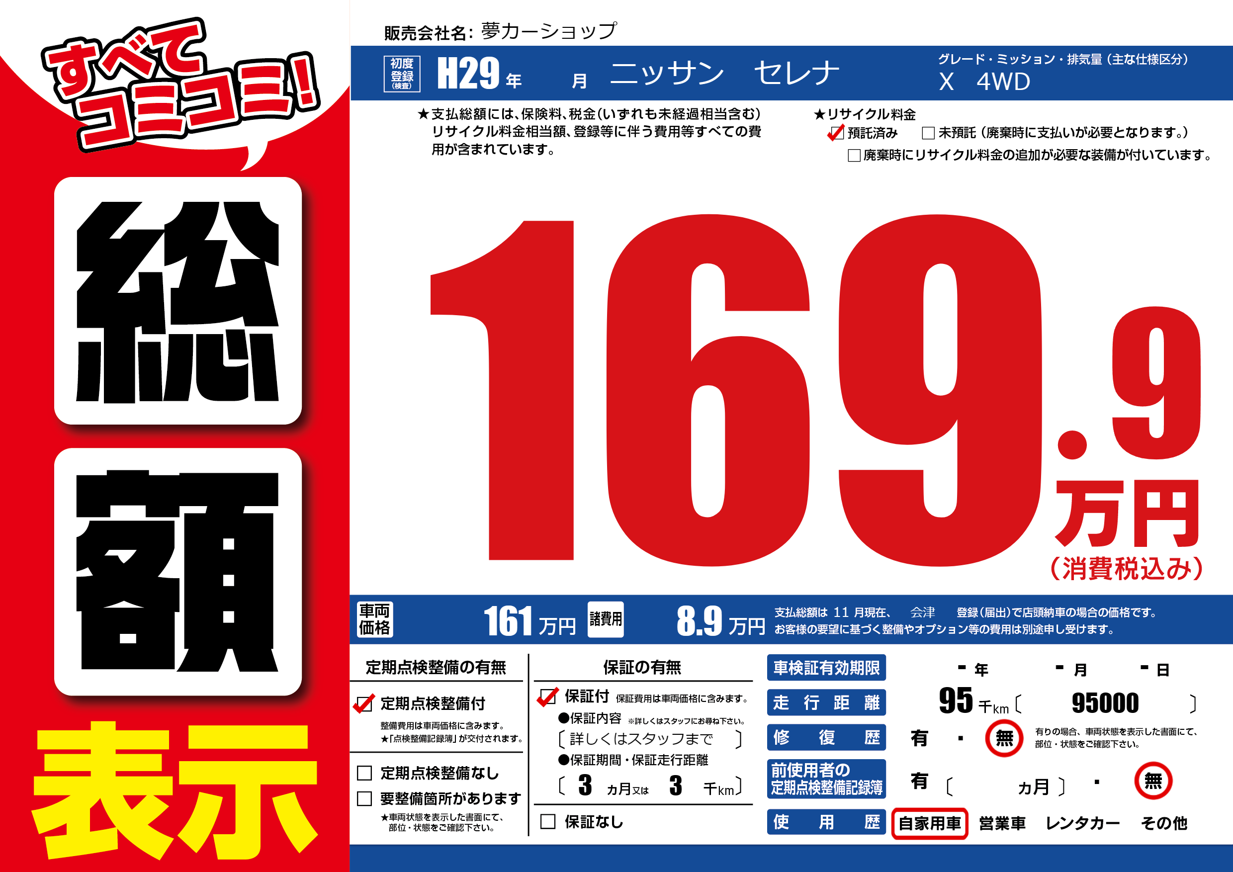 | 走行キロ | 9.5万km | 初年度登録 | H29年---月 |