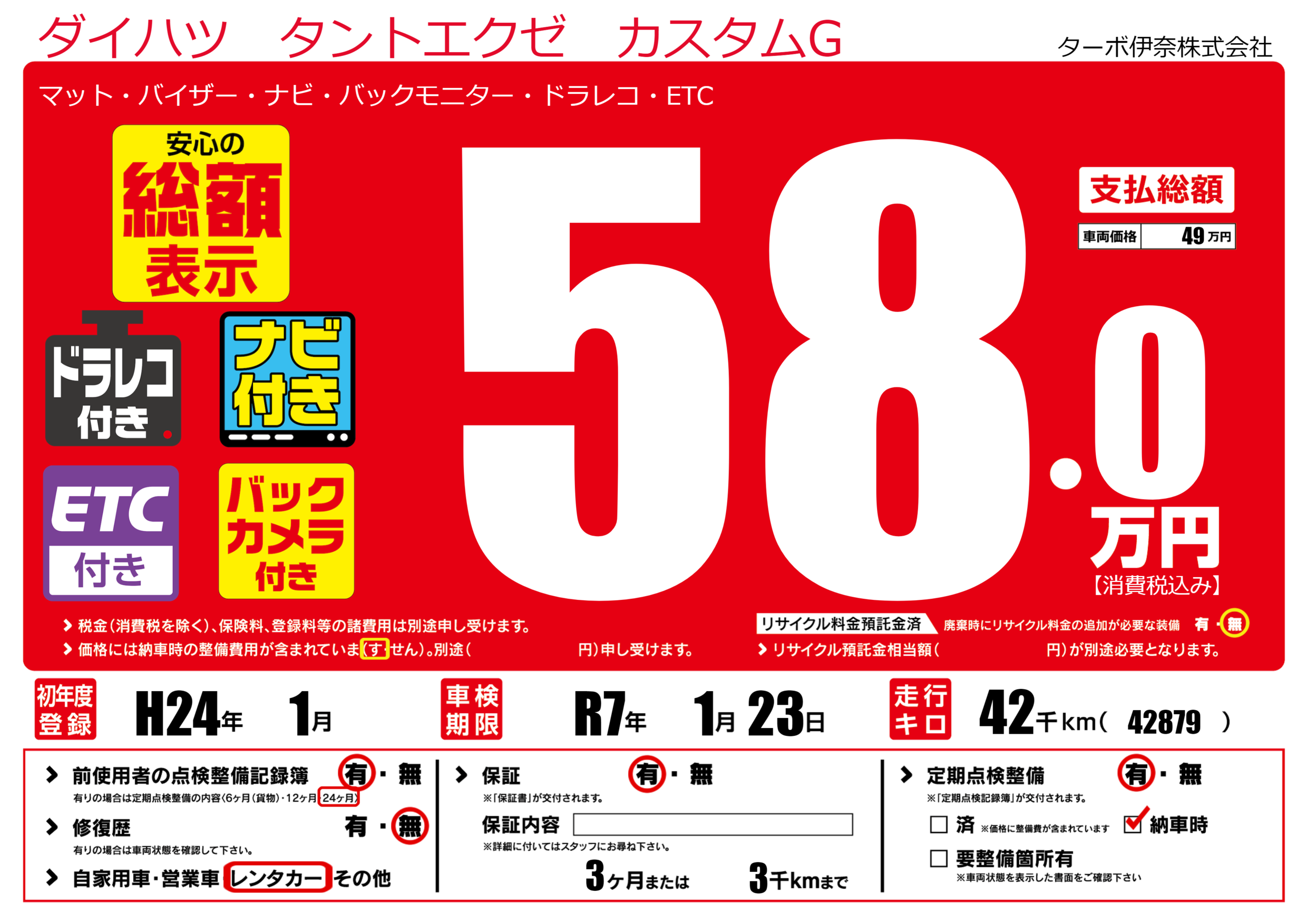 | 走行キロ | 4.2万km | 初年度登録 | H24年1月 |