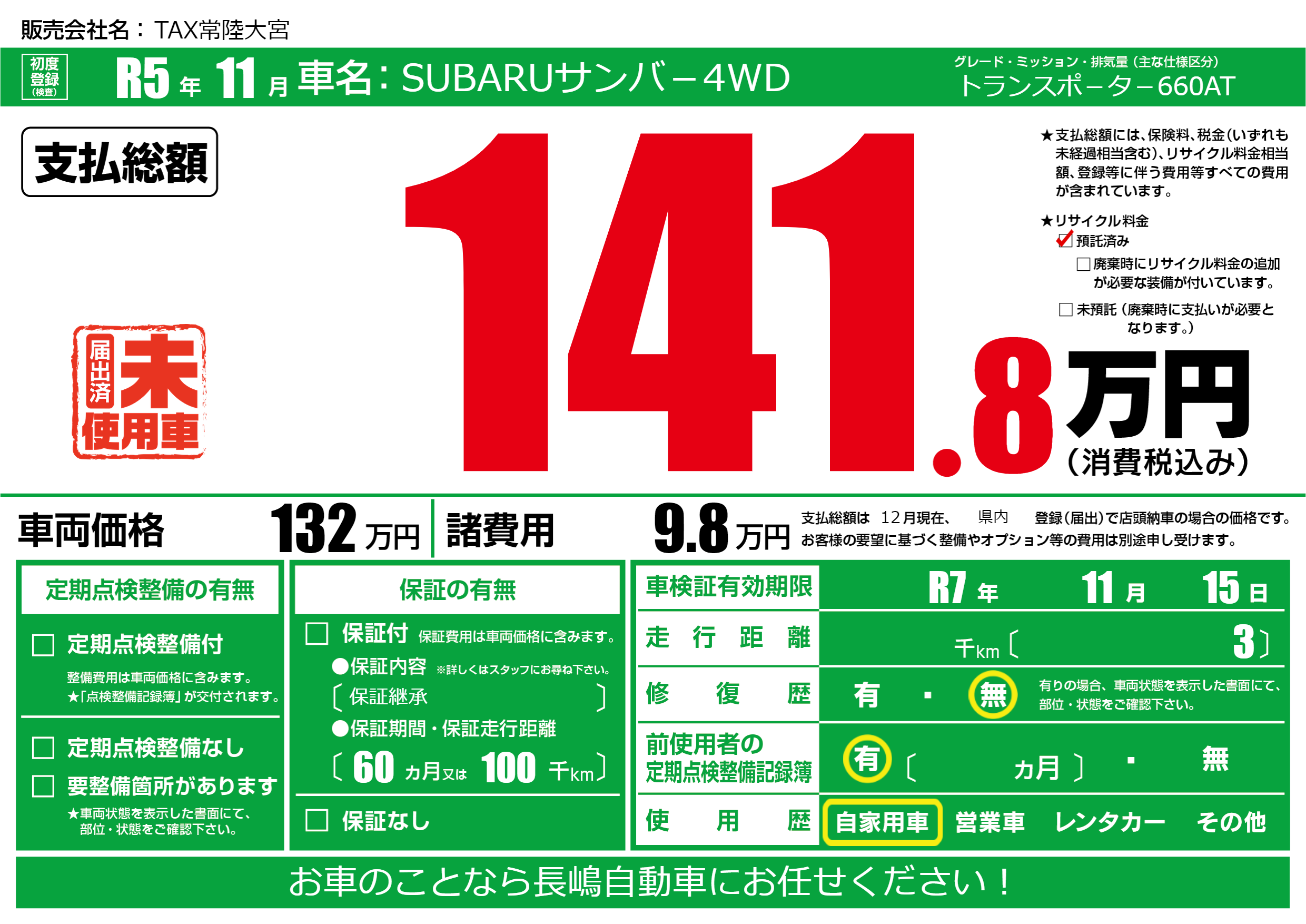 | 車名 | SUBARUサンバ-4WD | グレード ミッション 排気量 |