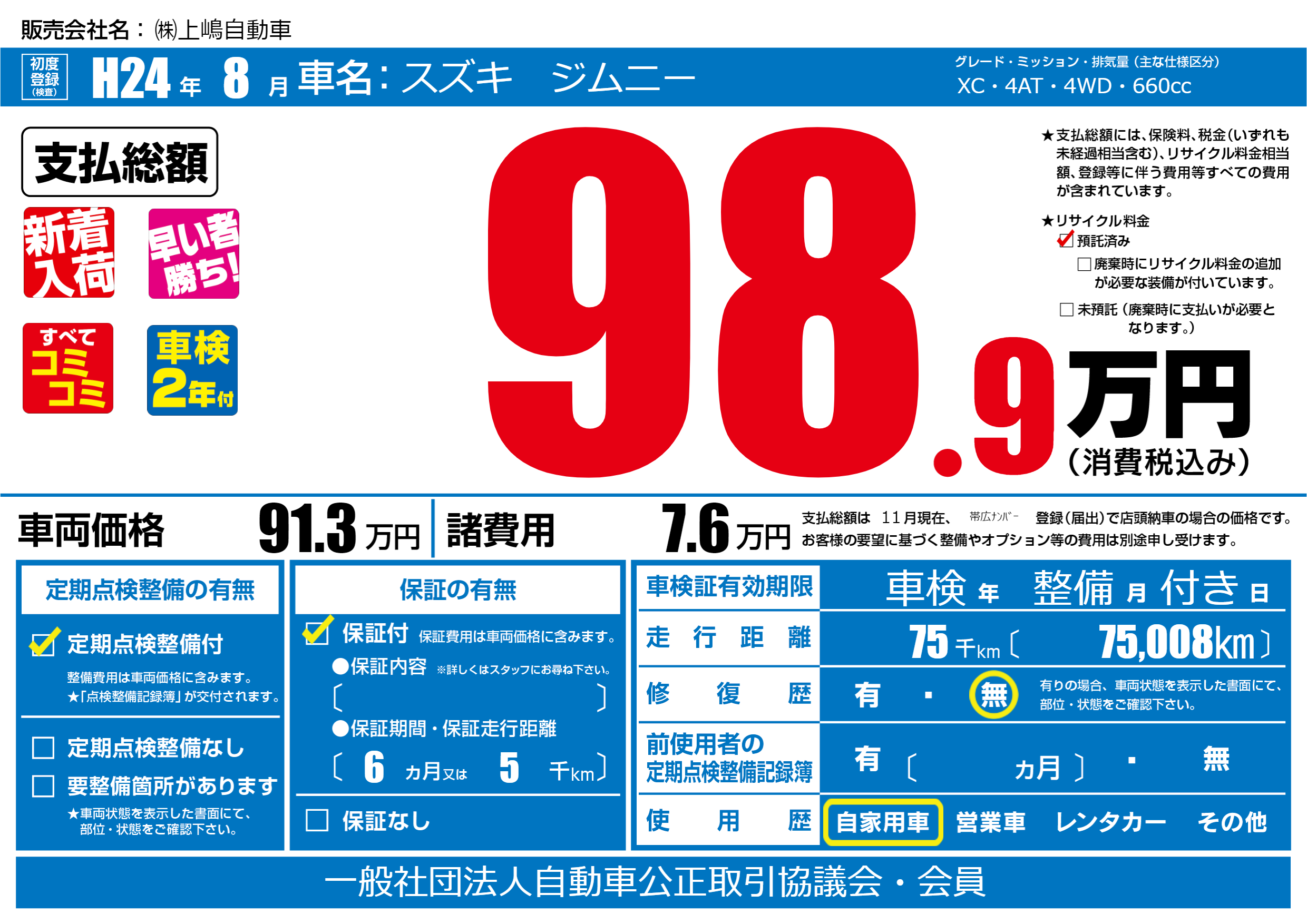| 車名 | スズキ ジムニー | グレード ミッション 排気量 |