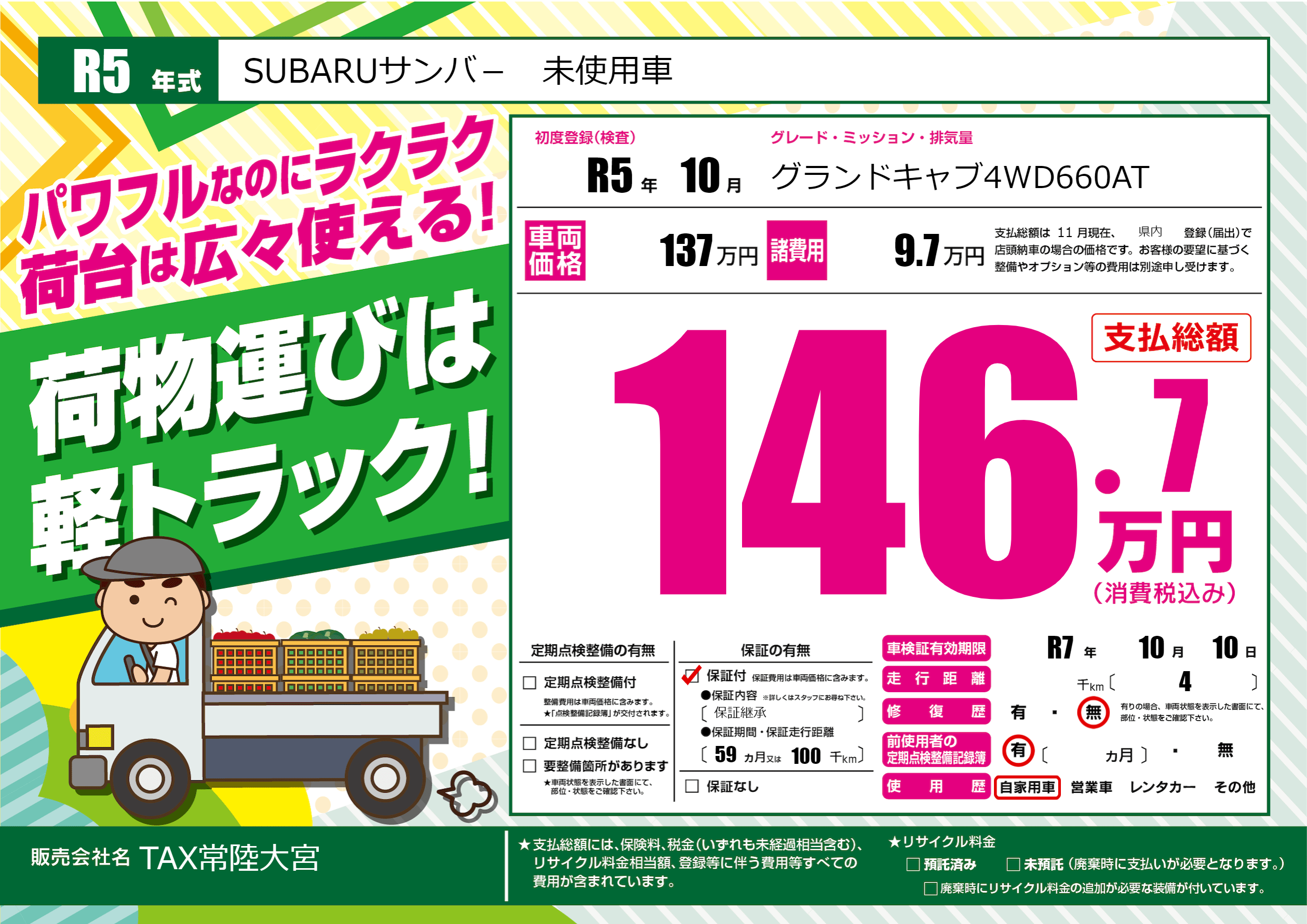 | 車名 | SUBARUサンバ- 未使用車 | グレード ミッション 排気量 |