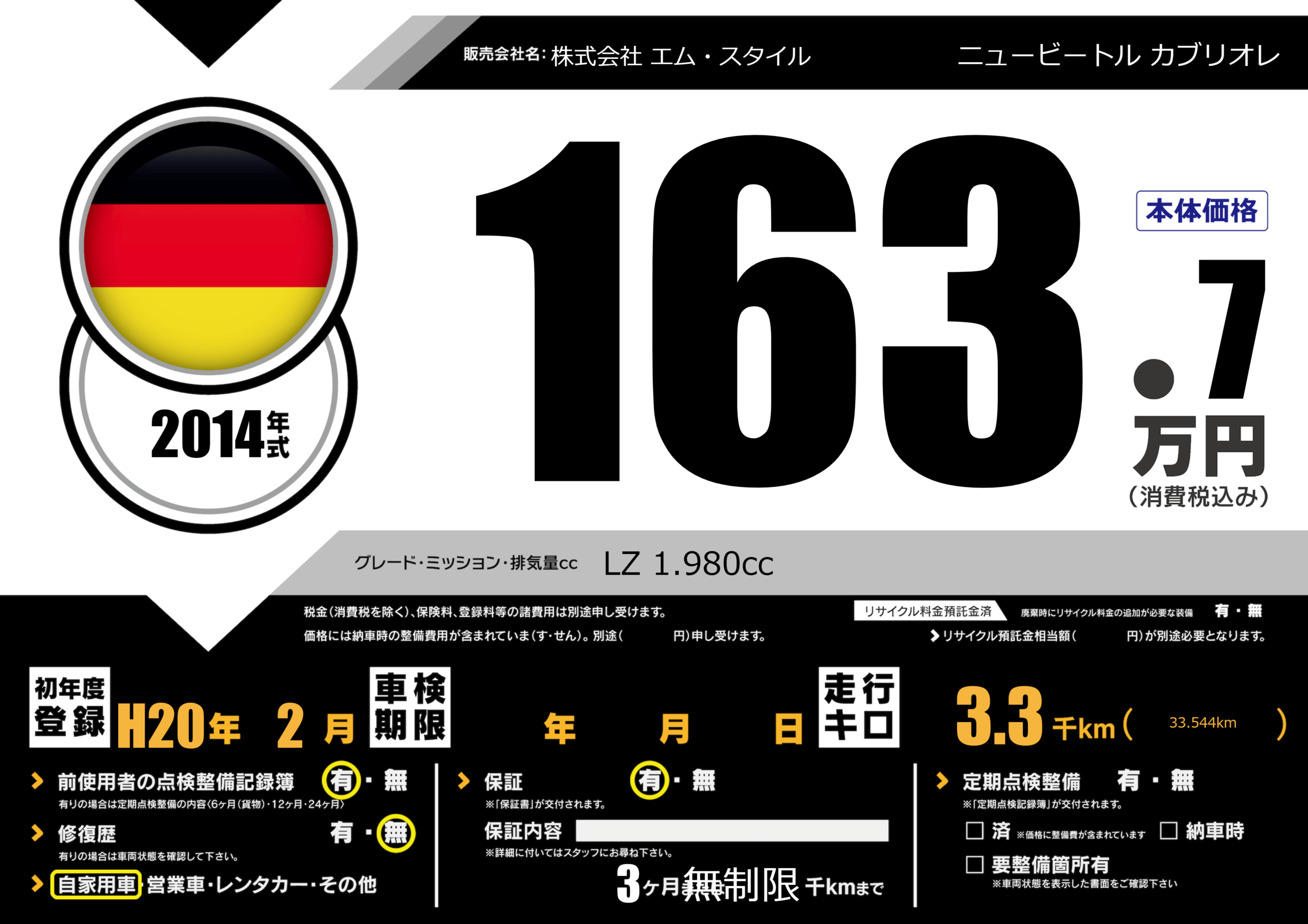 | 車名 | ニュービートル カブリオレ | グレード ミッション 排気量 |