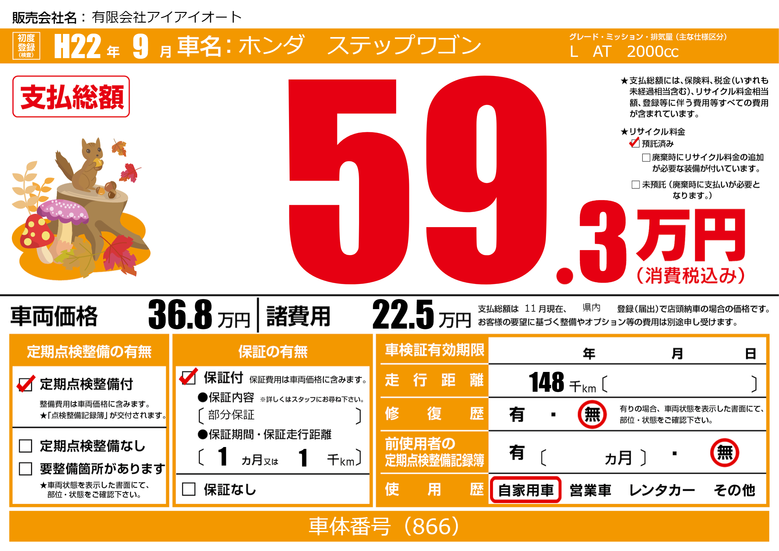 | 走行キロ | 14.8万km | 初年度登録 | H22年9月 |