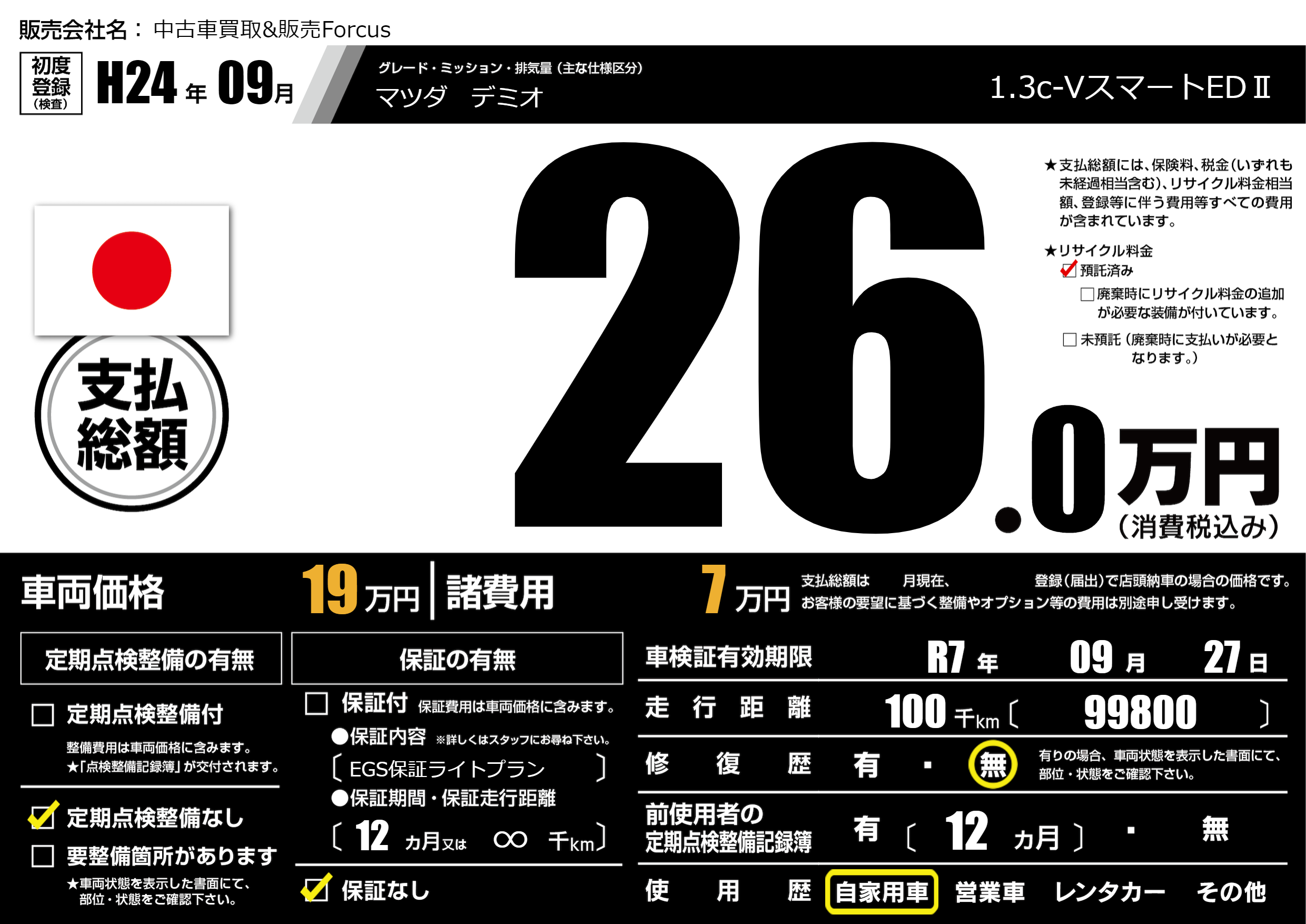 | 走行キロ | 10万km | 初年度登録 | H24年09月 |